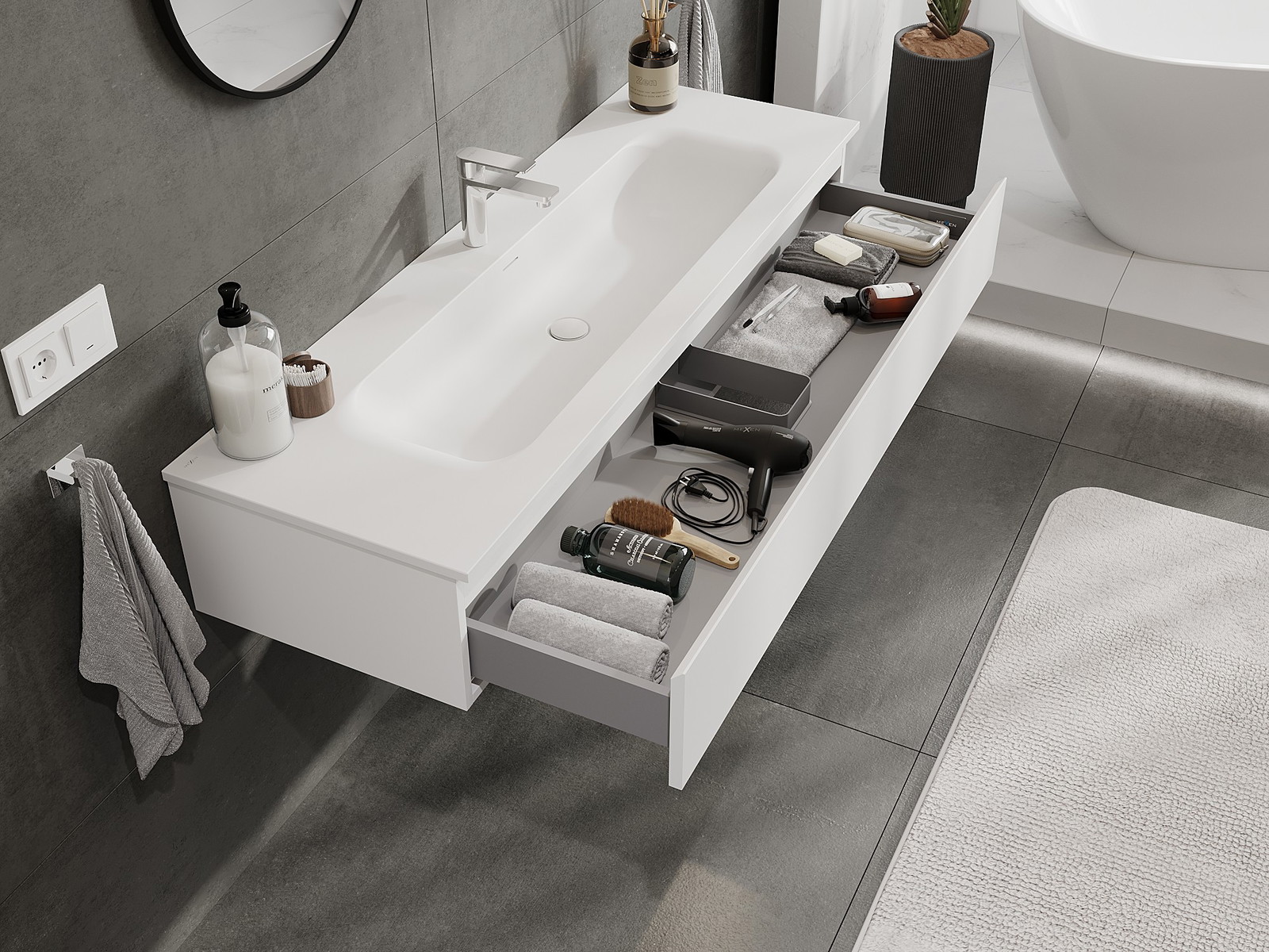Изрезът в чекмеджето е проектиран по такъв начин, че да побере сифона, който е необходим в мивковите инсталации. Благодарение на това мебелът може да бъде монтиран напълно функционално, без да се налага отказване от пространството в чекмеджето заради инсталацията.