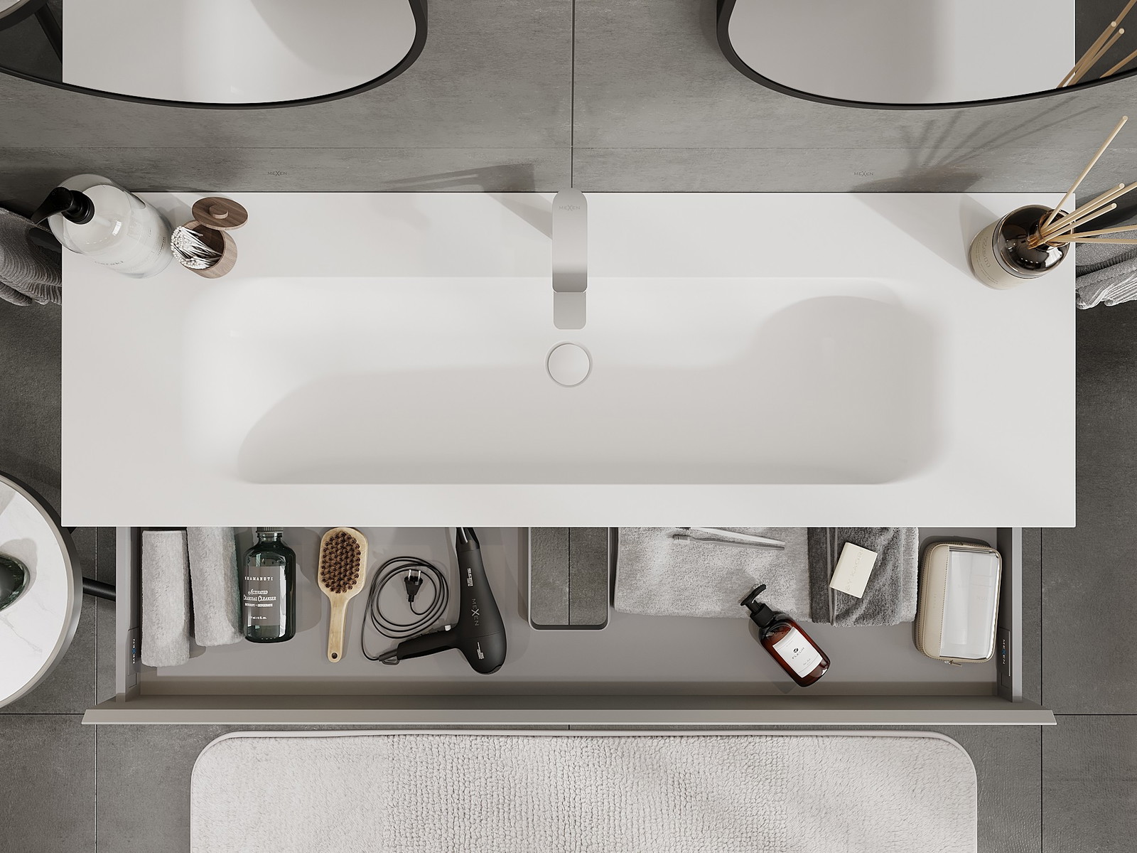 Изрезът в чекмеджето е проектиран по такъв начин, че да побере сифона, който е необходим в мивковите инсталации. Благодарение на това мебелът може да бъде монтиран напълно функционално, без да се налага отказване от пространството в чекмеджето заради инсталацията.