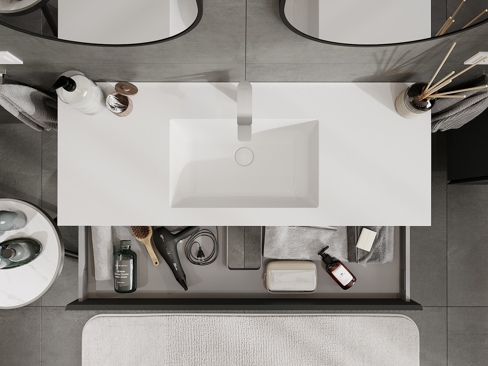 Изрезът в чекмеджето е проектиран по такъв начин, че да побере сифона, който е необходим в мивковите инсталации. Благодарение на това мебелът може да бъде монтиран напълно функционално, без да се налага отказване от пространството в чекмеджето заради инсталацията.