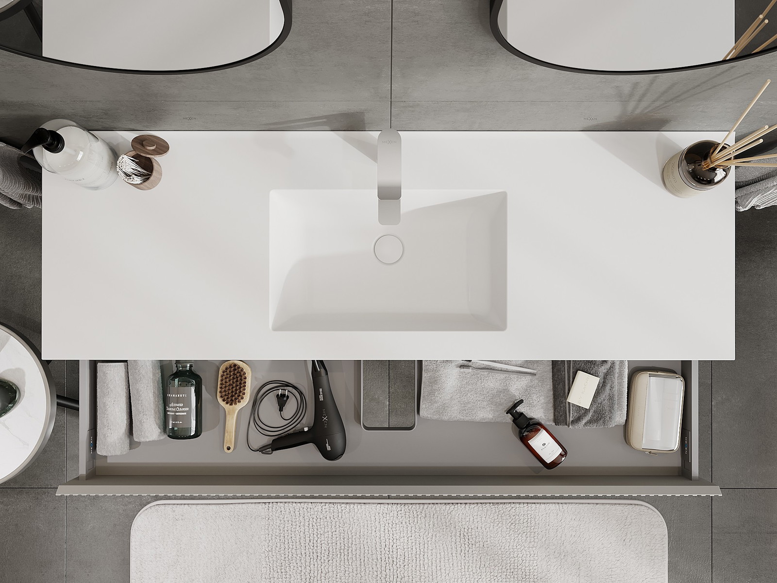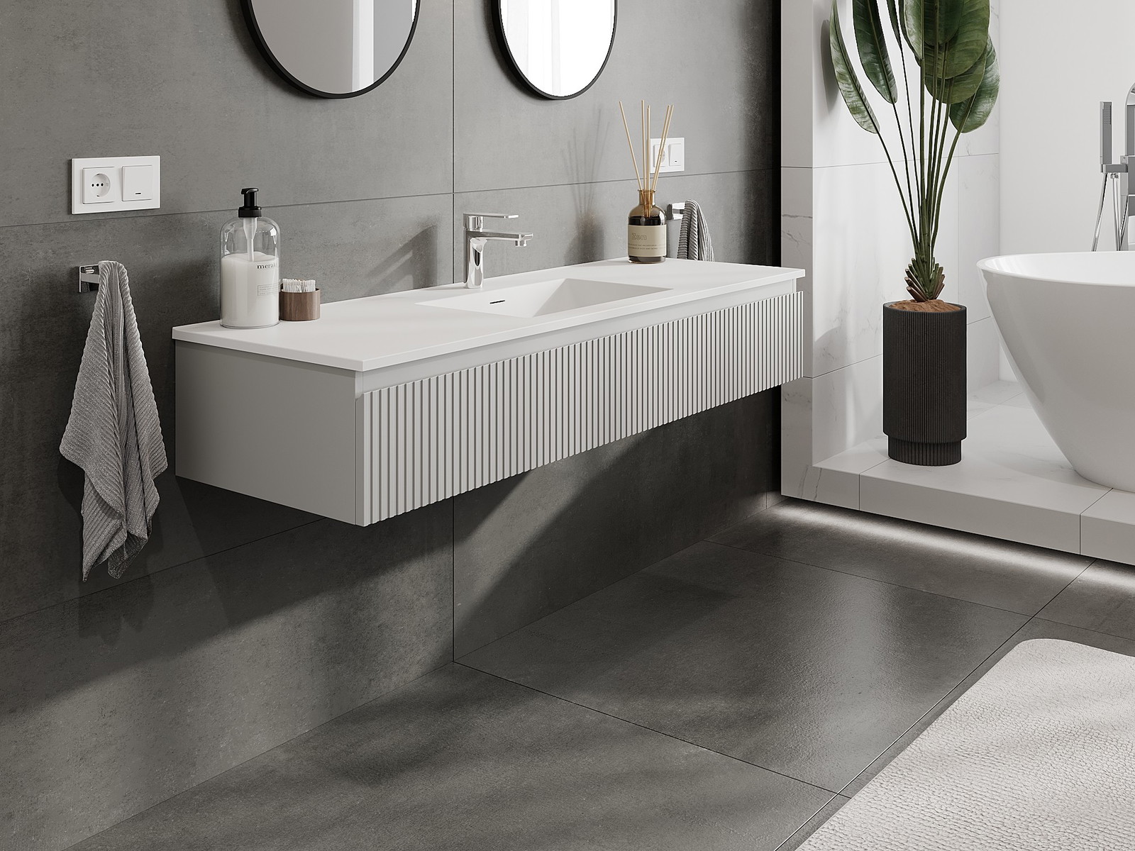 Mexen Rivel шкаф за баня 140 см с мивка Otis, 1 чекмедже, оребрен, сив мат/бял мат
