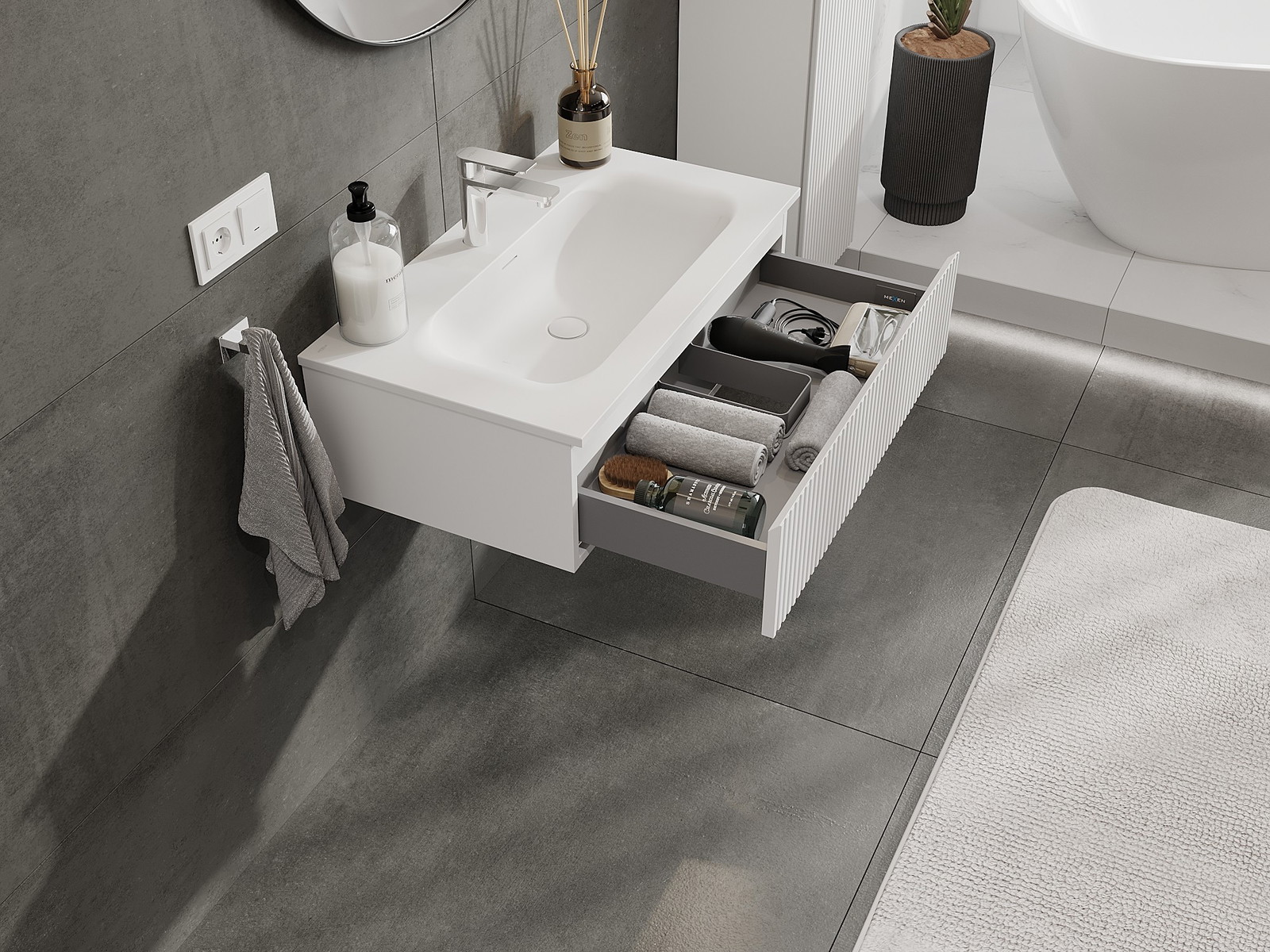 Изрезът в чекмеджето е проектиран по такъв начин, че да побере сифона, който е необходим в мивковите инсталации. Благодарение на това мебелът може да бъде монтиран напълно функционално, без да се налага отказване от пространството в чекмеджето заради инсталацията.