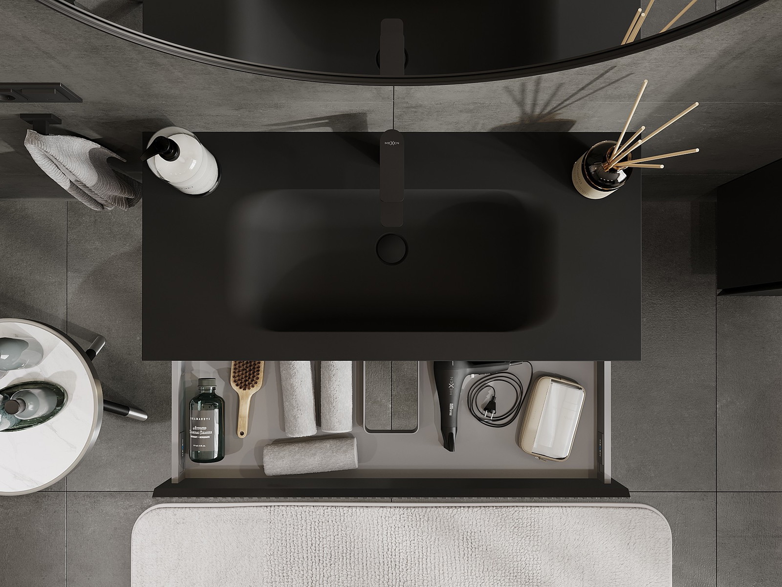 Изрезът в чекмеджето е проектиран по такъв начин, че да побере сифона, който е необходим в мивковите инсталации. Благодарение на това мебелът може да бъде монтиран напълно функционално, без да се налага отказване от пространството в чекмеджето заради инсталацията.