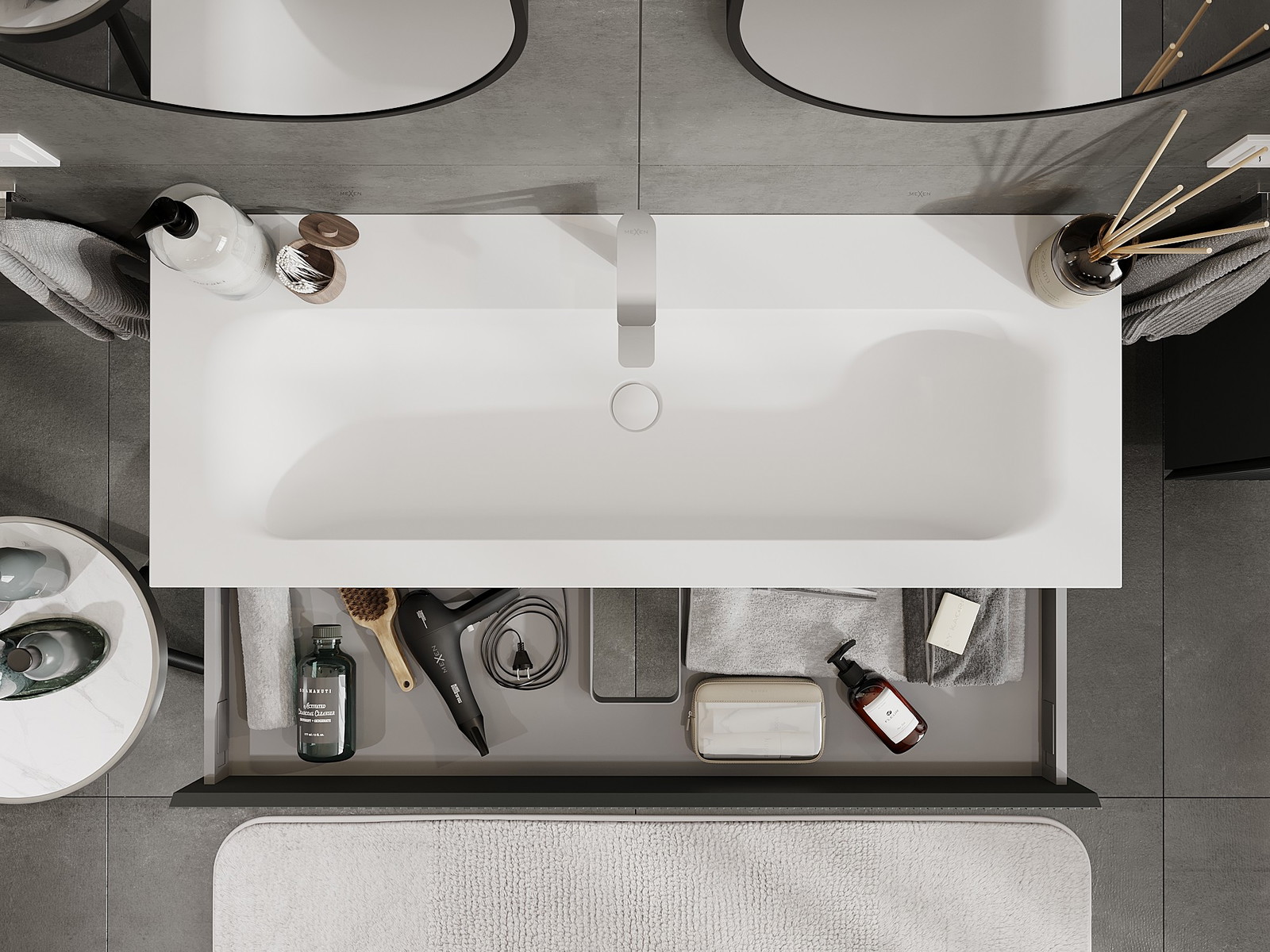 Изрезът в чекмеджето е проектиран по такъв начин, че да побере сифона, който е необходим в мивковите инсталации. Благодарение на това мебелът може да бъде монтиран напълно функционално, без да се налага отказване от пространството в чекмеджето заради инсталацията.