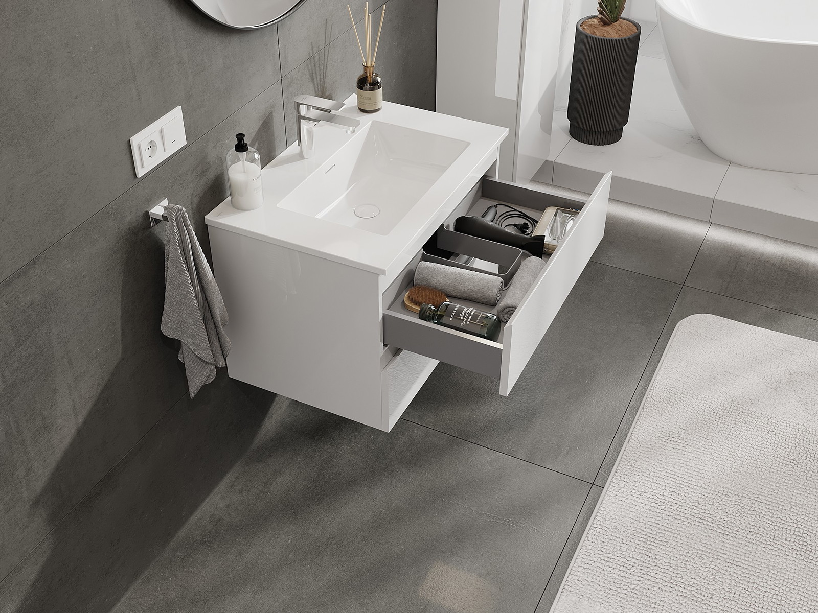 Корпусът на шкафа се доставя напълно сглобен, което означава максимално удобство и спестяване на време. Не е нужно да губите часове за сглобяване на мебела – просто го монтирайте на избраното място в банята. Това е идеалното решение за хора, които ценят бързия монтаж и незабавния ефект.