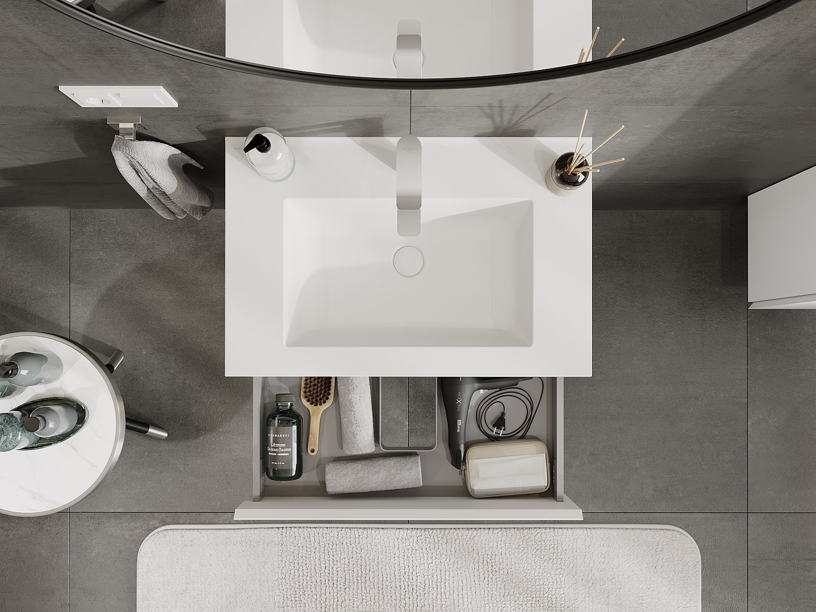 Изрезът в чекмеджето е проектиран по такъв начин, че да побере сифона, който е необходим в мивковите инсталации. Благодарение на това мебелът може да бъде монтиран напълно функционално, без да се налага отказване от пространството в чекмеджето заради инсталацията.