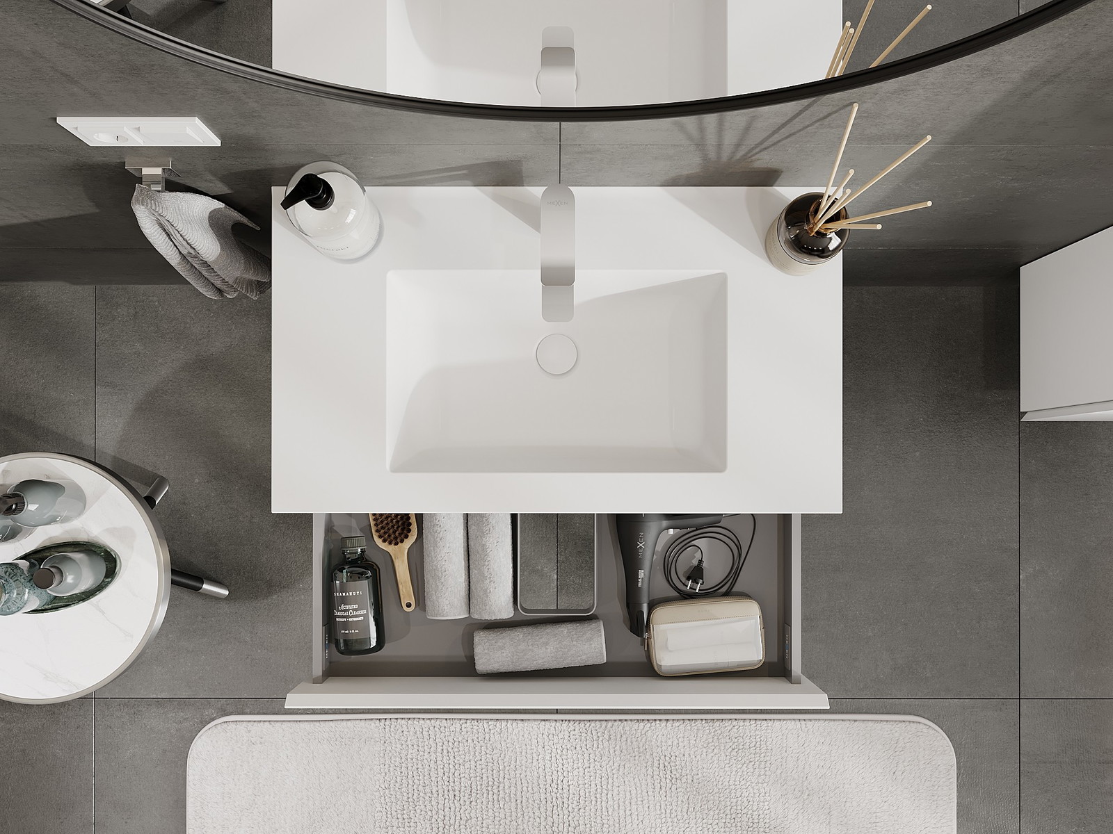 Изрезът в чекмеджето е проектиран по такъв начин, че да побере сифона, който е необходим в мивковите инсталации. Благодарение на това мебелът може да бъде монтиран напълно функционално, без да се налага отказване от пространството в чекмеджето заради инсталацията.