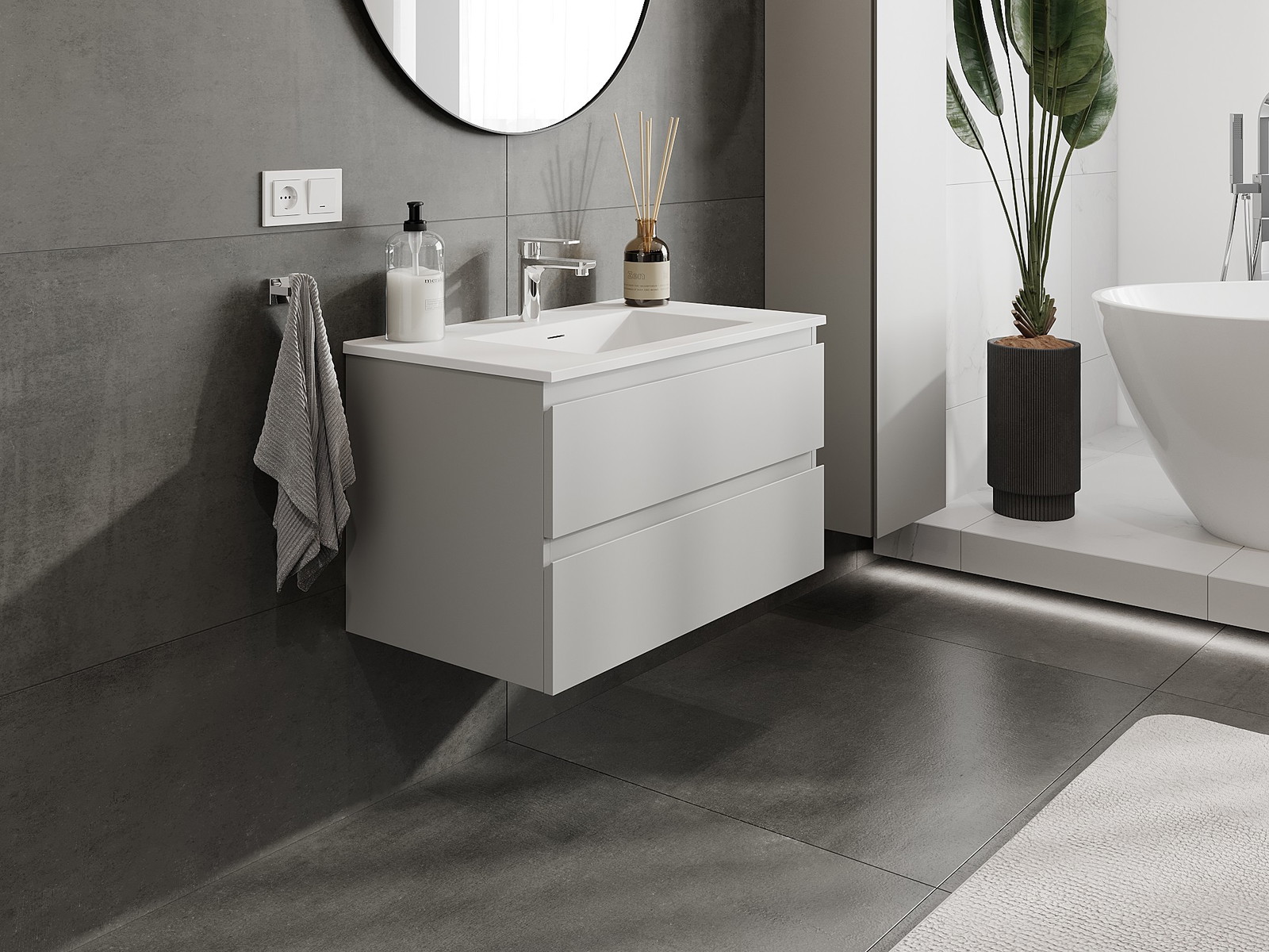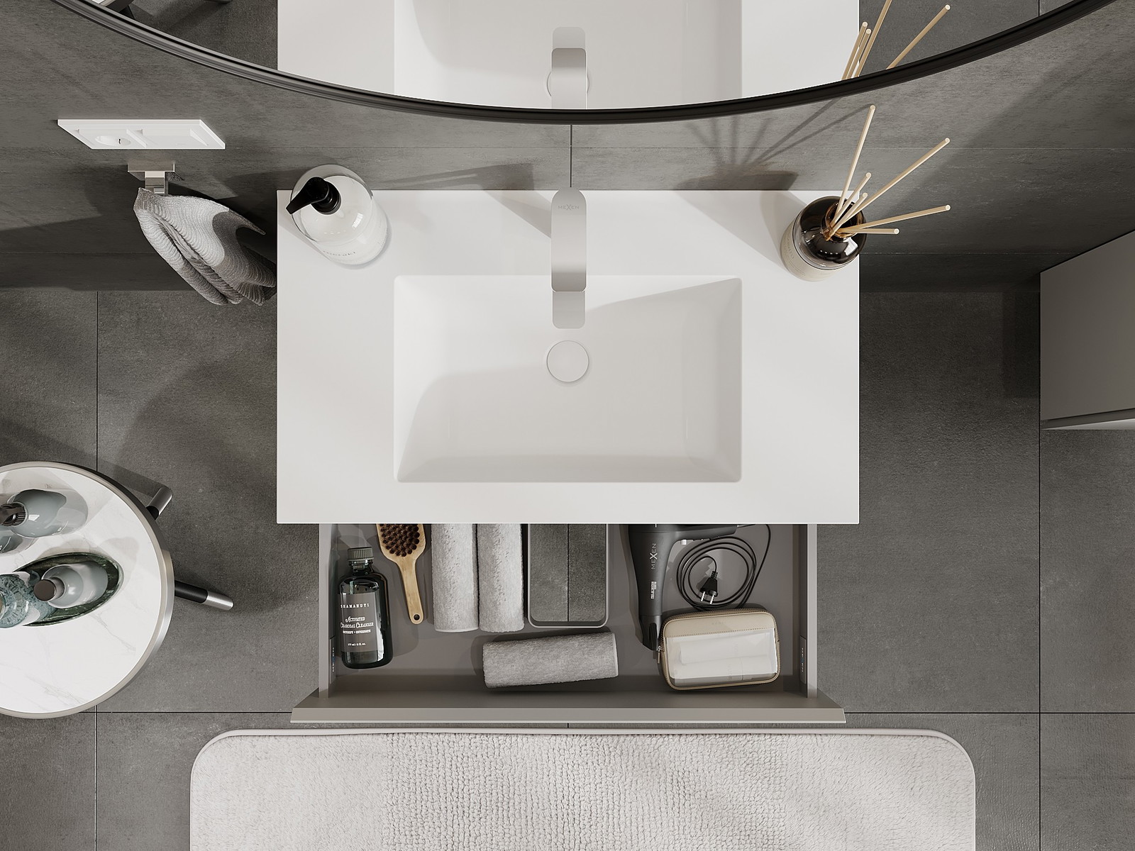 Корпусът на шкафа се доставя напълно сглобен, което означава максимално удобство и спестяване на време. Не е нужно да губите часове за сглобяване на мебела – просто го монтирайте на избраното място в банята. Това е идеалното решение за хора, които ценят бързия монтаж и незабавния ефект.