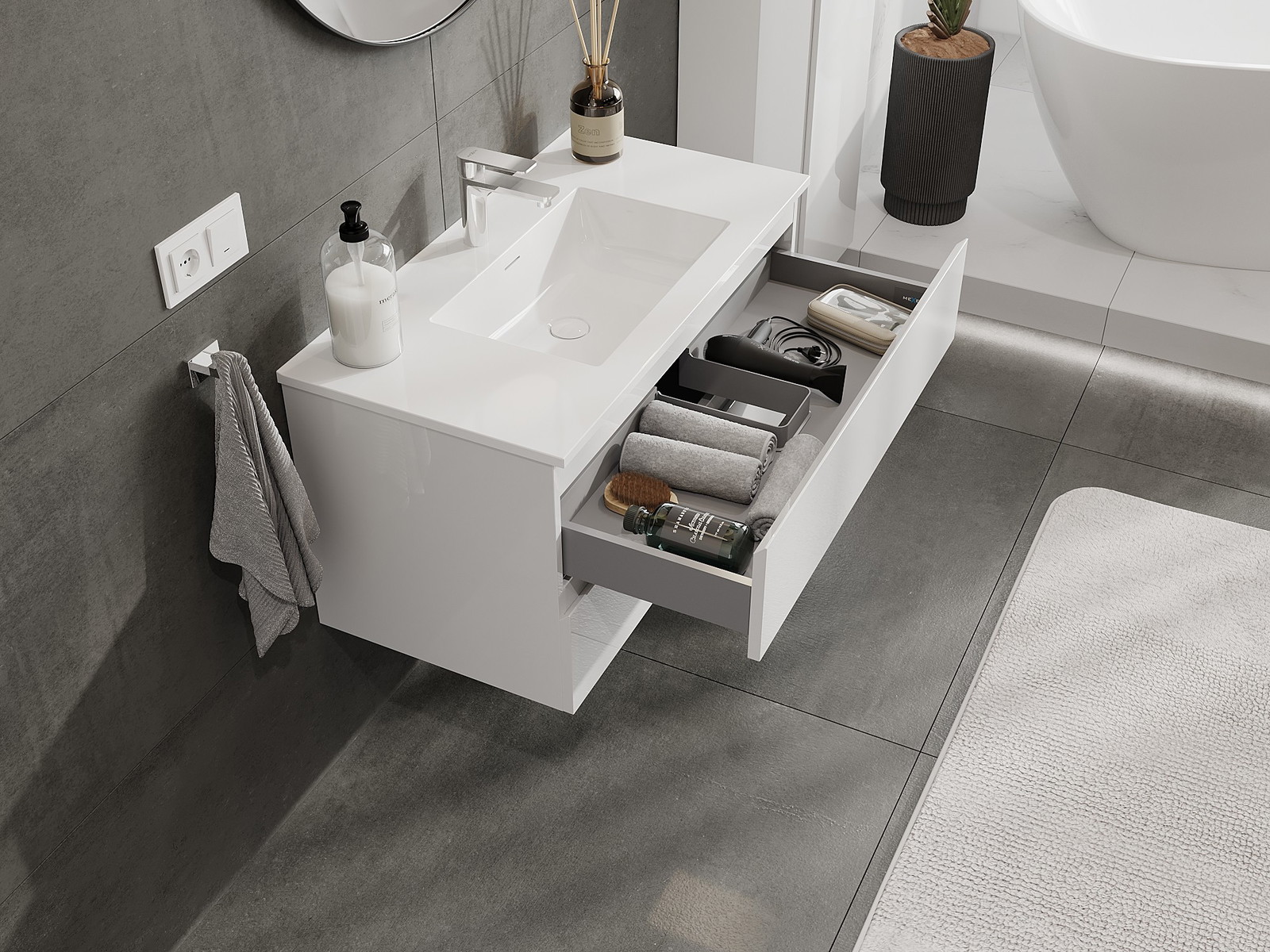 Корпусът на шкафа се доставя напълно сглобен, което означава максимално удобство и спестяване на време. Не е нужно да губите часове за сглобяване на мебела – просто го монтирайте на избраното място в банята. Това е идеалното решение за хора, които ценят бързия монтаж и незабавния ефект.