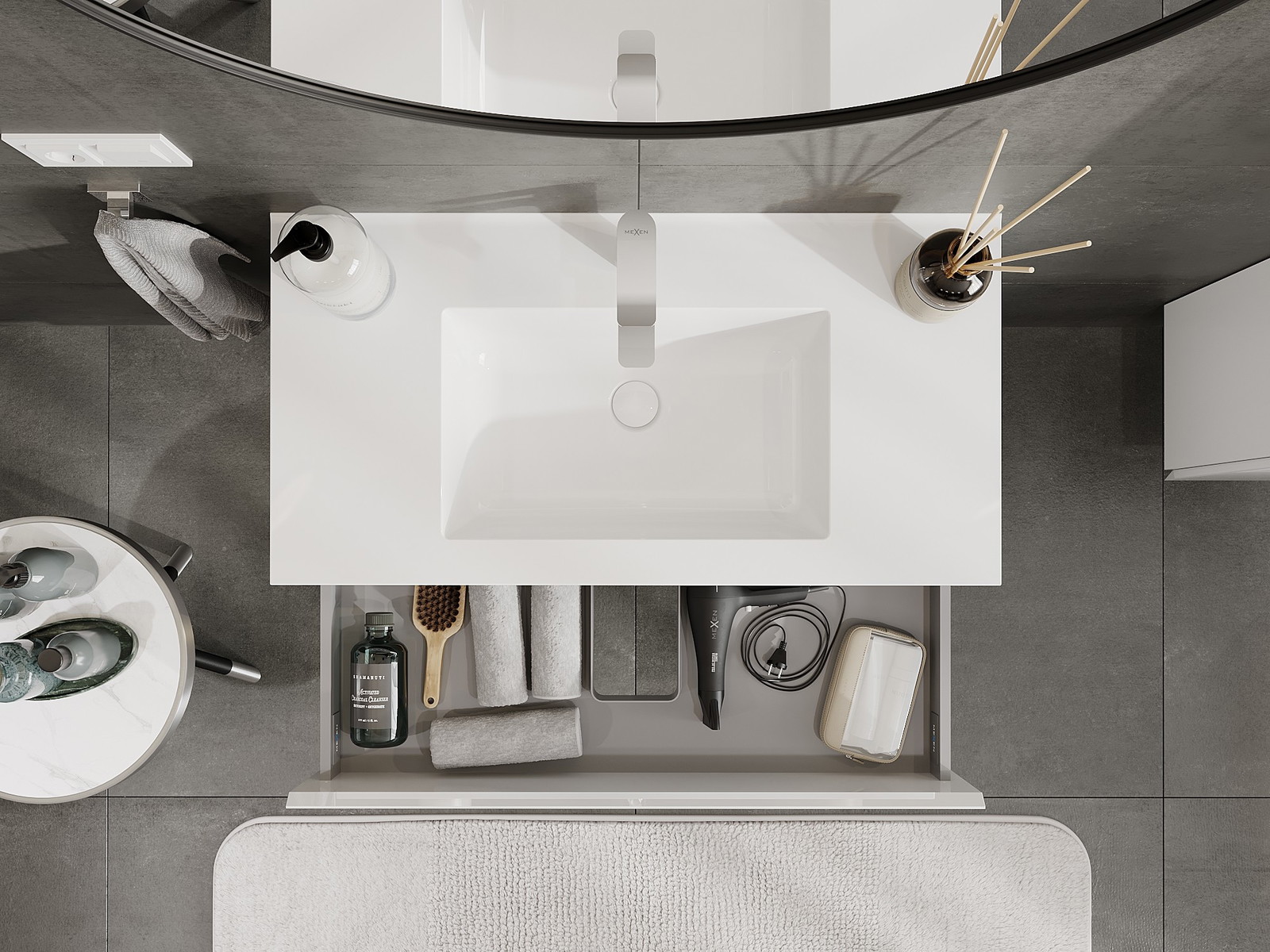 Изрезът в чекмеджето е проектиран по такъв начин, че да побере сифона, който е необходим в мивковите инсталации. Благодарение на това мебелът може да бъде монтиран напълно функционално, без да се налага отказване от пространството в чекмеджето заради инсталацията.