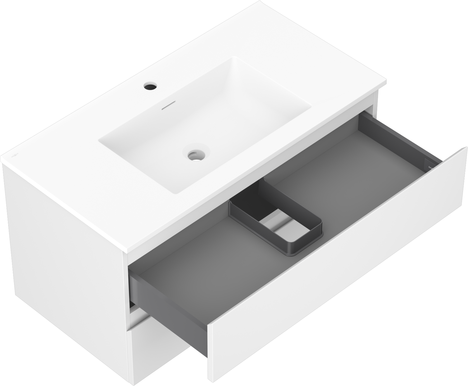 Изрезът в чекмеджето е предназначен за поставяне на сифона, който е от съществено значение за инсталациите на умивалника. Това позволява на мебелта да се монтира по напълно функционален начин, без да се налага да се отделя място в чекмеджето за инсталацията.