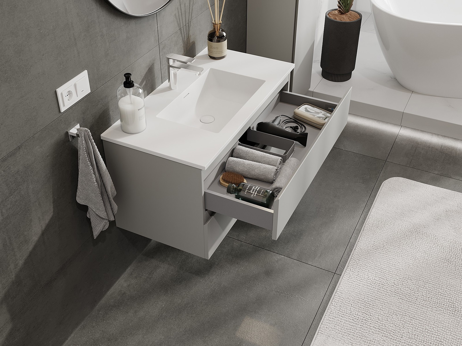 Нашите модулни мебели за баня могат да се комбинират в различни цветови конфигурации, което позволява пълна персонализация. Може да се избере както външният вид, така и функциите на отделните елементи, което позволява съчетаване на мебелите със собствените стилови и функционални предпочитания.
