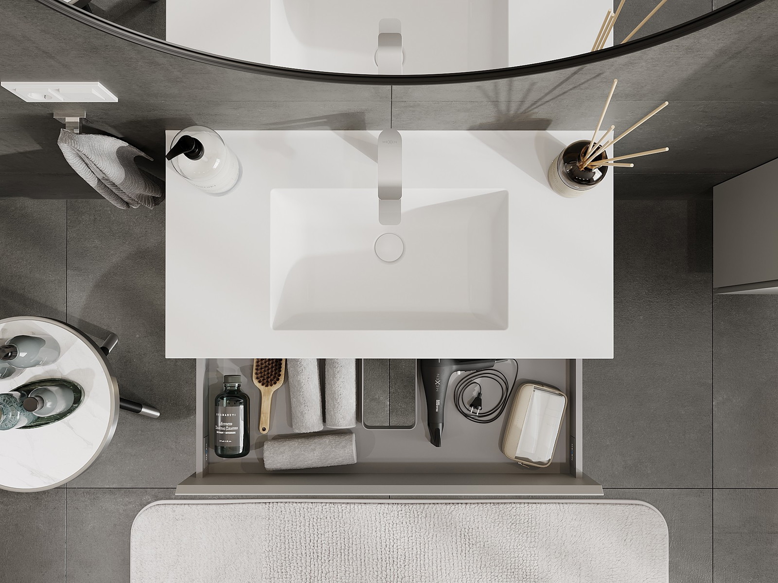 Изрезът в чекмеджето е проектиран по такъв начин, че да побере сифона, който е необходим в мивковите инсталации. Благодарение на това мебелът може да бъде монтиран напълно функционално, без да се налага отказване от пространството в чекмеджето заради инсталацията.