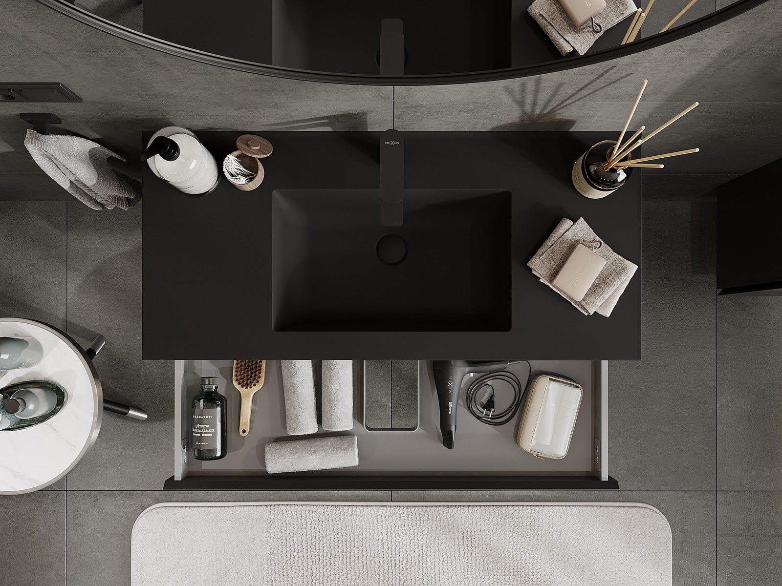 Изрезът в чекмеджето е проектиран по такъв начин, че да побере сифона, който е необходим в мивковите инсталации. Благодарение на това мебелът може да бъде монтиран напълно функционално, без да се налага отказване от пространството в чекмеджето заради инсталацията.