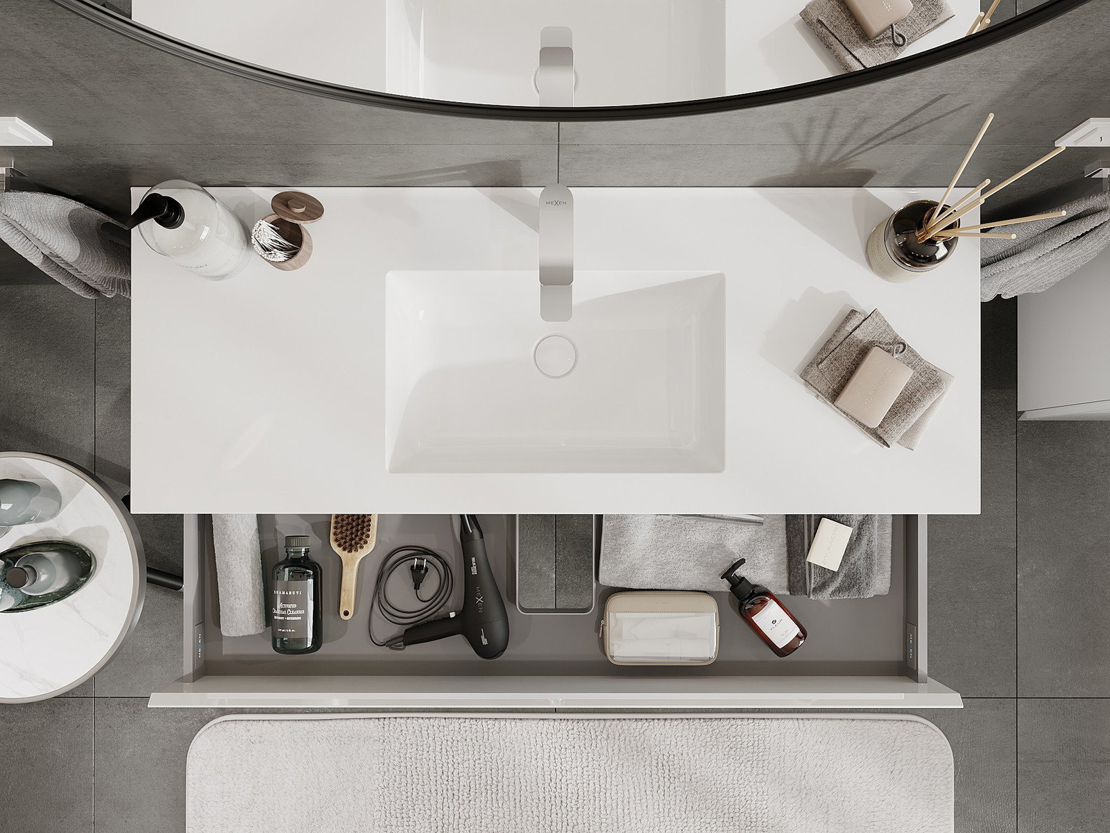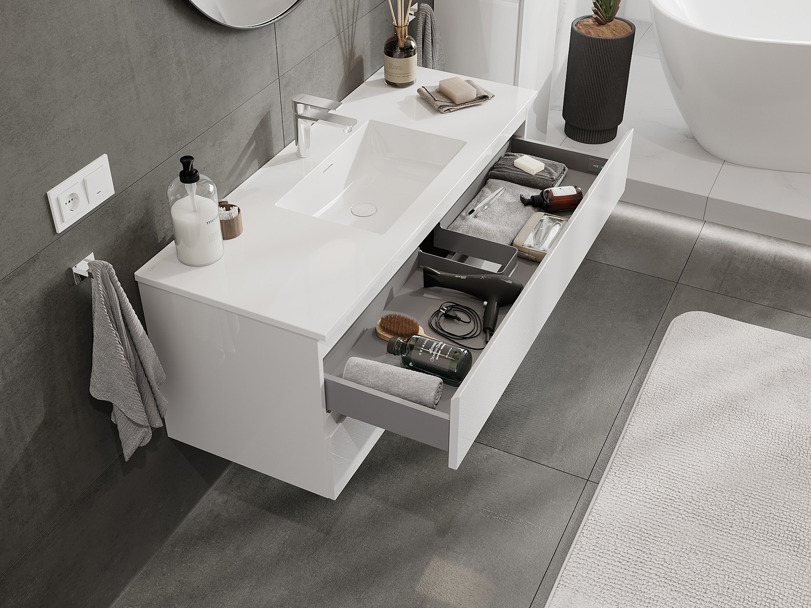 Изрезът в чекмеджето е проектиран по такъв начин, че да побере сифона, който е необходим в мивковите инсталации. Благодарение на това мебелът може да бъде монтиран напълно функционално, без да се налага отказване от пространството в чекмеджето заради инсталацията.