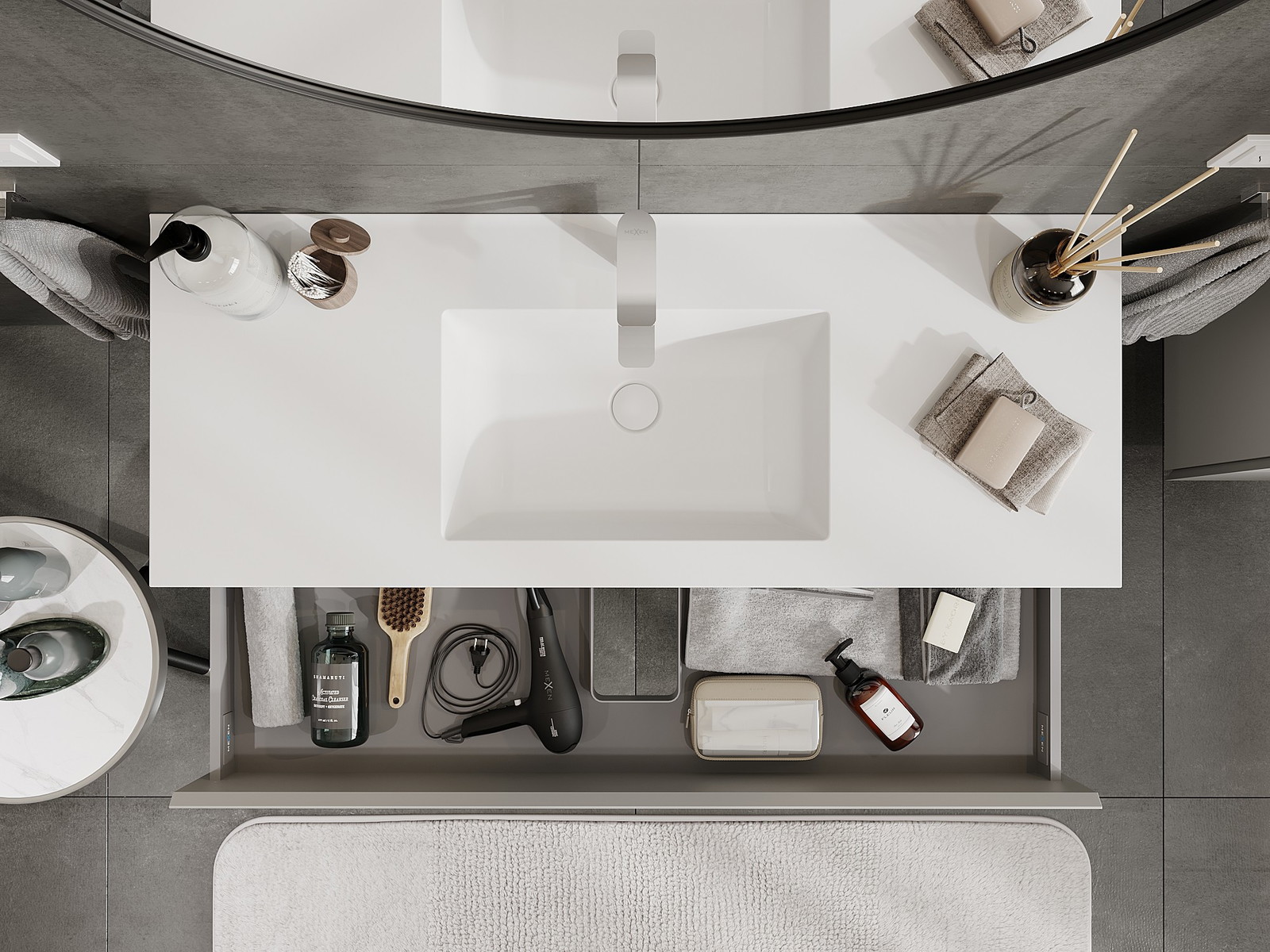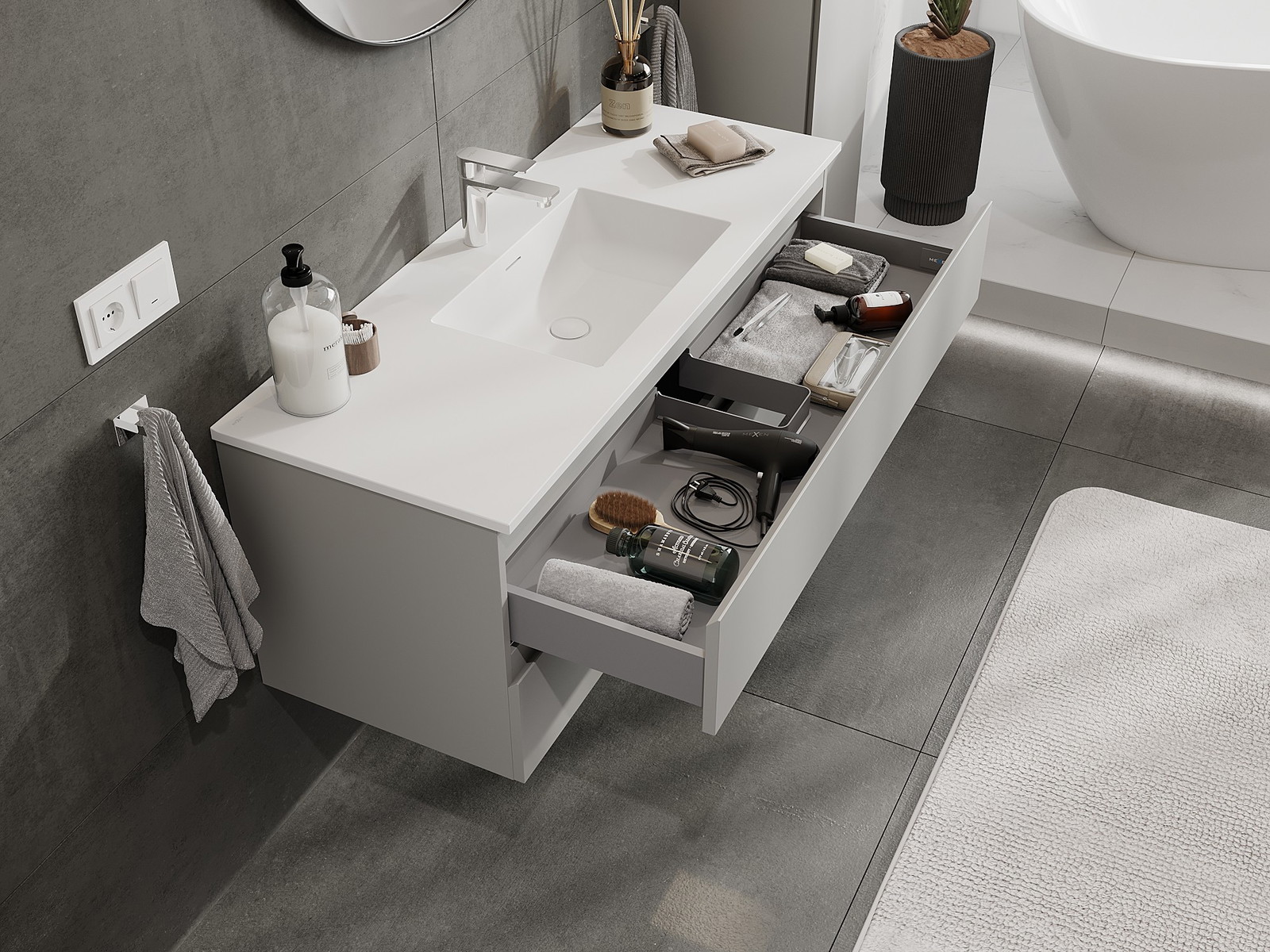Изрезът в чекмеджето е проектиран по такъв начин, че да побере сифона, който е необходим в мивковите инсталации. Благодарение на това мебелът може да бъде монтиран напълно функционално, без да се налага отказване от пространството в чекмеджето заради инсталацията.
