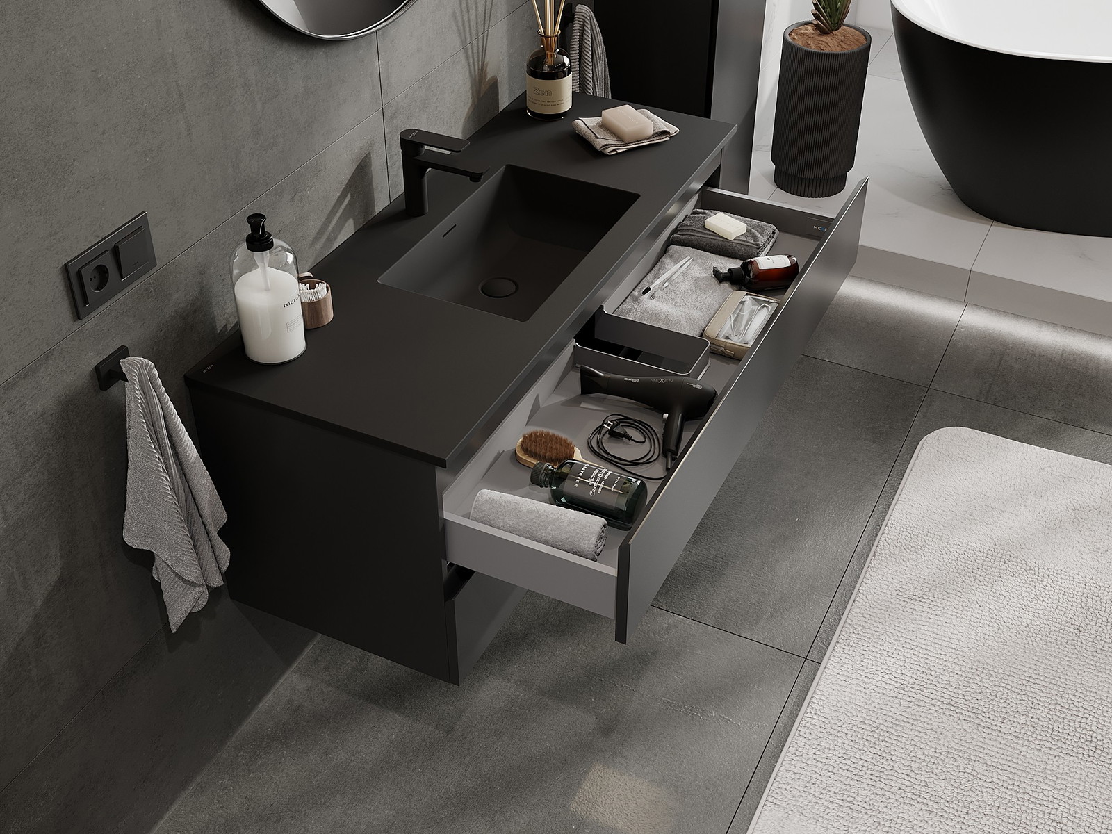 Изрезът в чекмеджето е проектиран по такъв начин, че да побере сифона, който е необходим в мивковите инсталации. Благодарение на това мебелът може да бъде монтиран напълно функционално, без да се налага отказване от пространството в чекмеджето заради инсталацията.