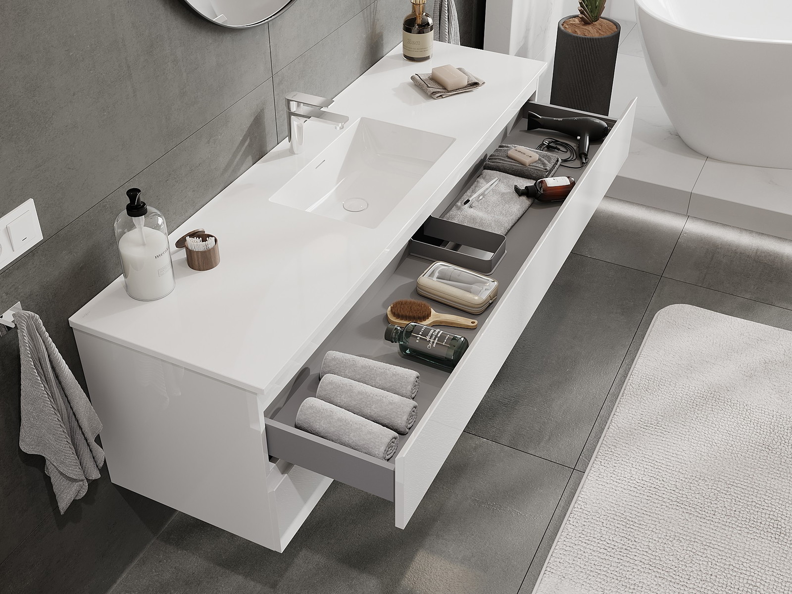 Нашите модулни мебели за баня могат да се комбинират в различни цветови конфигурации, което позволява пълна персонализация. Може да се избере както външният вид, така и функциите на отделните елементи, което позволява съчетаване на мебелите със собствените стилови и функционални предпочитания.