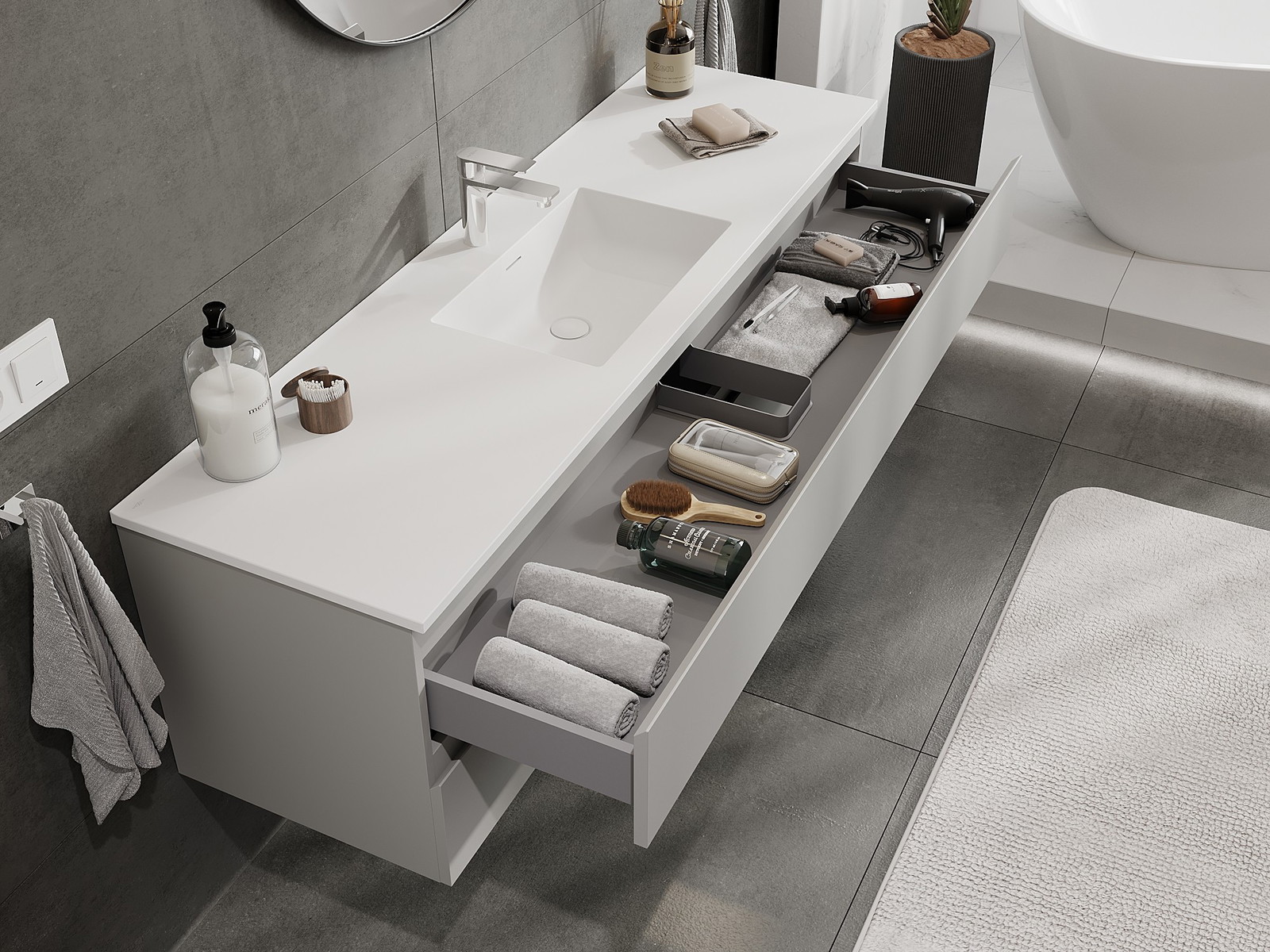 Нашите модулни мебели за баня могат да се комбинират в различни цветови конфигурации, което позволява пълна персонализация. Може да се избере както външният вид, така и функциите на отделните елементи, което позволява съчетаване на мебелите със собствените стилови и функционални предпочитания.
