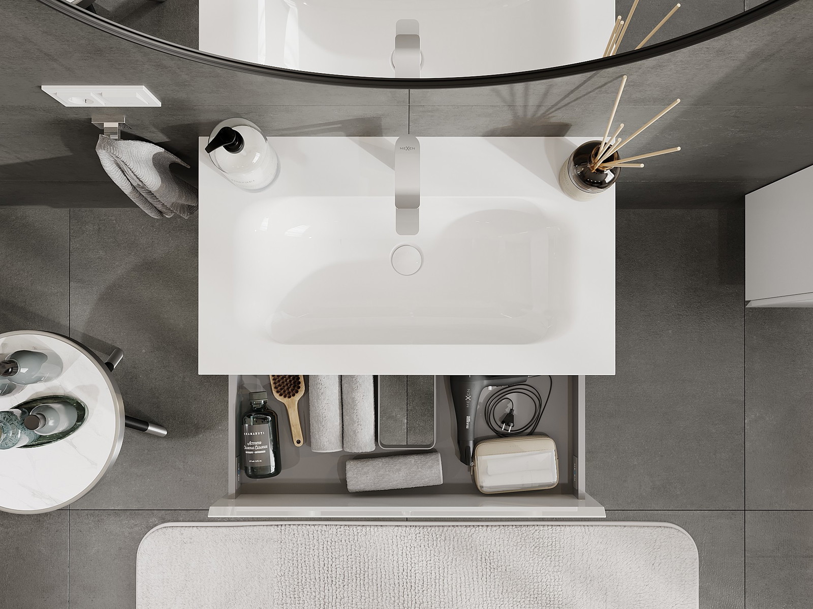 Изрезът в чекмеджето е проектиран по такъв начин, че да побере сифона, който е необходим в мивковите инсталации. Благодарение на това мебелът може да бъде монтиран напълно функционално, без да се налага отказване от пространството в чекмеджето заради инсталацията.