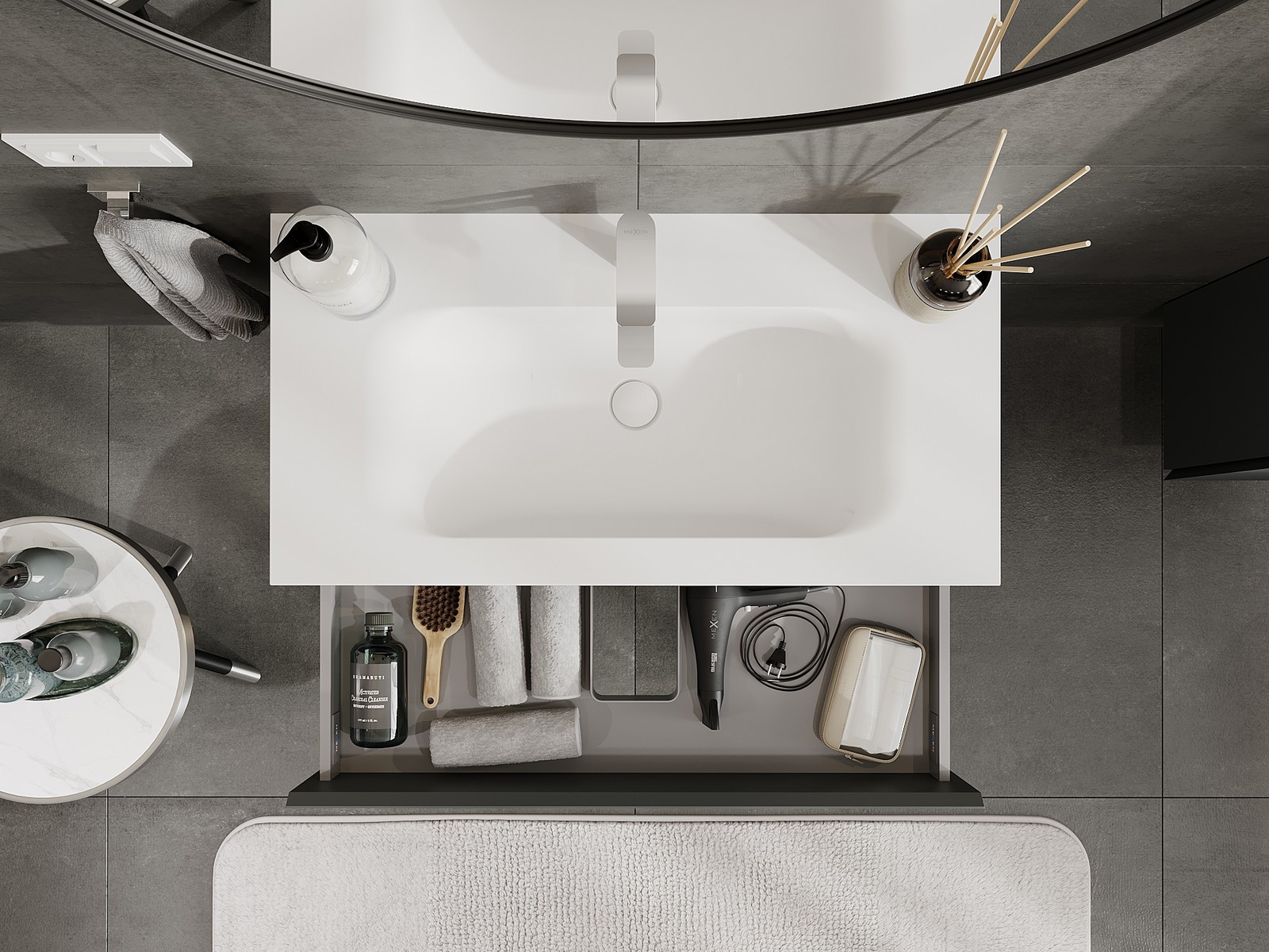 Изрезът в чекмеджето е проектиран по такъв начин, че да побере сифона, който е необходим в мивковите инсталации. Благодарение на това мебелът може да бъде монтиран напълно функционално, без да се налага отказване от пространството в чекмеджето заради инсталацията.
