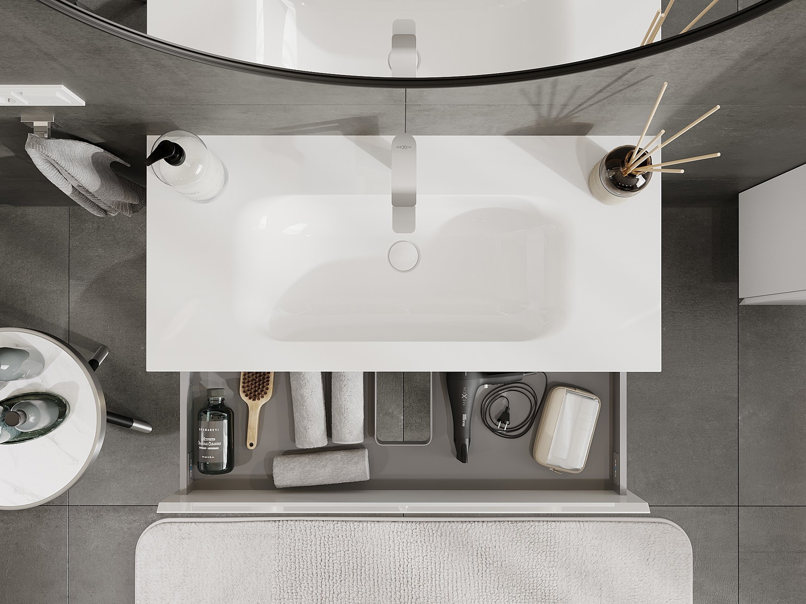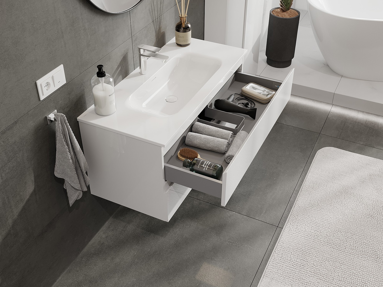 Изрезът в чекмеджето е проектиран по такъв начин, че да побере сифона, който е необходим в мивковите инсталации. Благодарение на това мебелът може да бъде монтиран напълно функционално, без да се налага отказване от пространството в чекмеджето заради инсталацията.