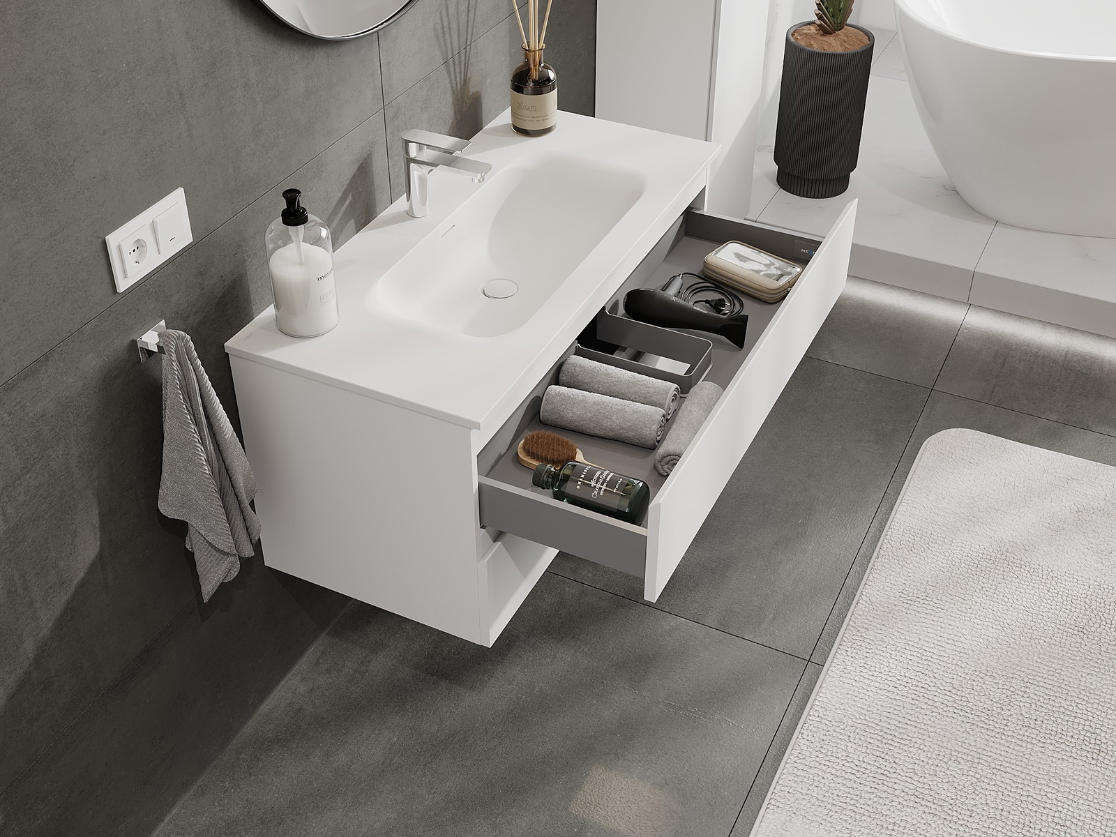Нашите модулни мебели за баня могат да се комбинират в различни цветови конфигурации, което позволява пълна персонализация. Може да се избере както външният вид, така и функциите на отделните елементи, което позволява съчетаване на мебелите със собствените стилови и функционални предпочитания.