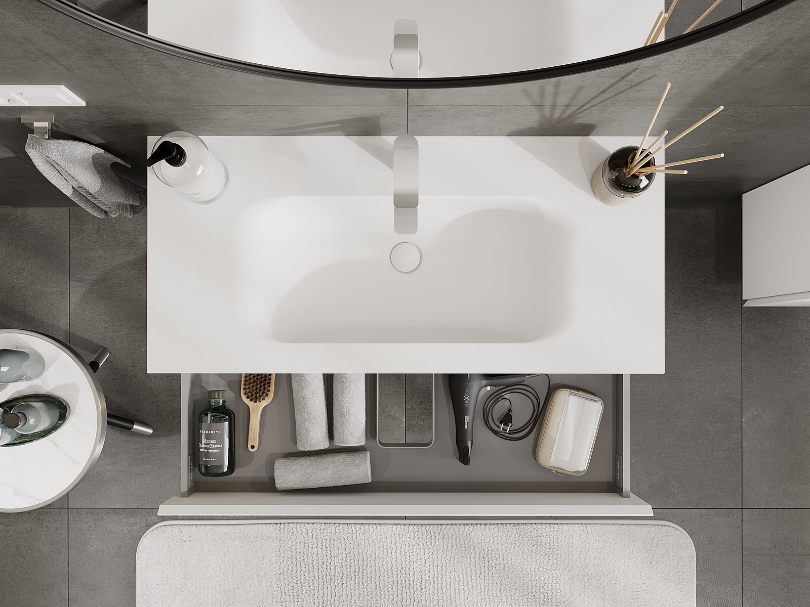 Изрезът в чекмеджето е проектиран по такъв начин, че да побере сифона, който е необходим в мивковите инсталации. Благодарение на това мебелът може да бъде монтиран напълно функционално, без да се налага отказване от пространството в чекмеджето заради инсталацията.