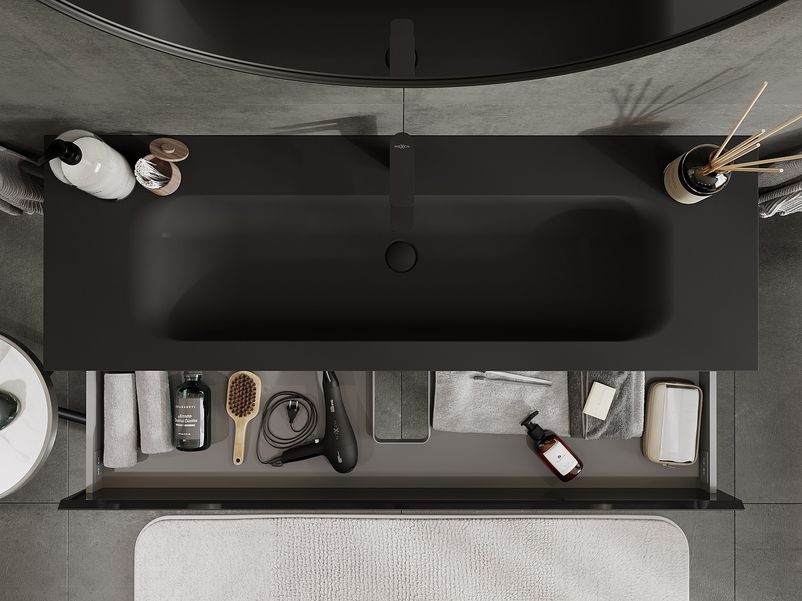 Изрезът в чекмеджето е проектиран по такъв начин, че да побере сифона, който е необходим в мивковите инсталации. Благодарение на това мебелът може да бъде монтиран напълно функционално, без да се налага отказване от пространството в чекмеджето заради инсталацията.