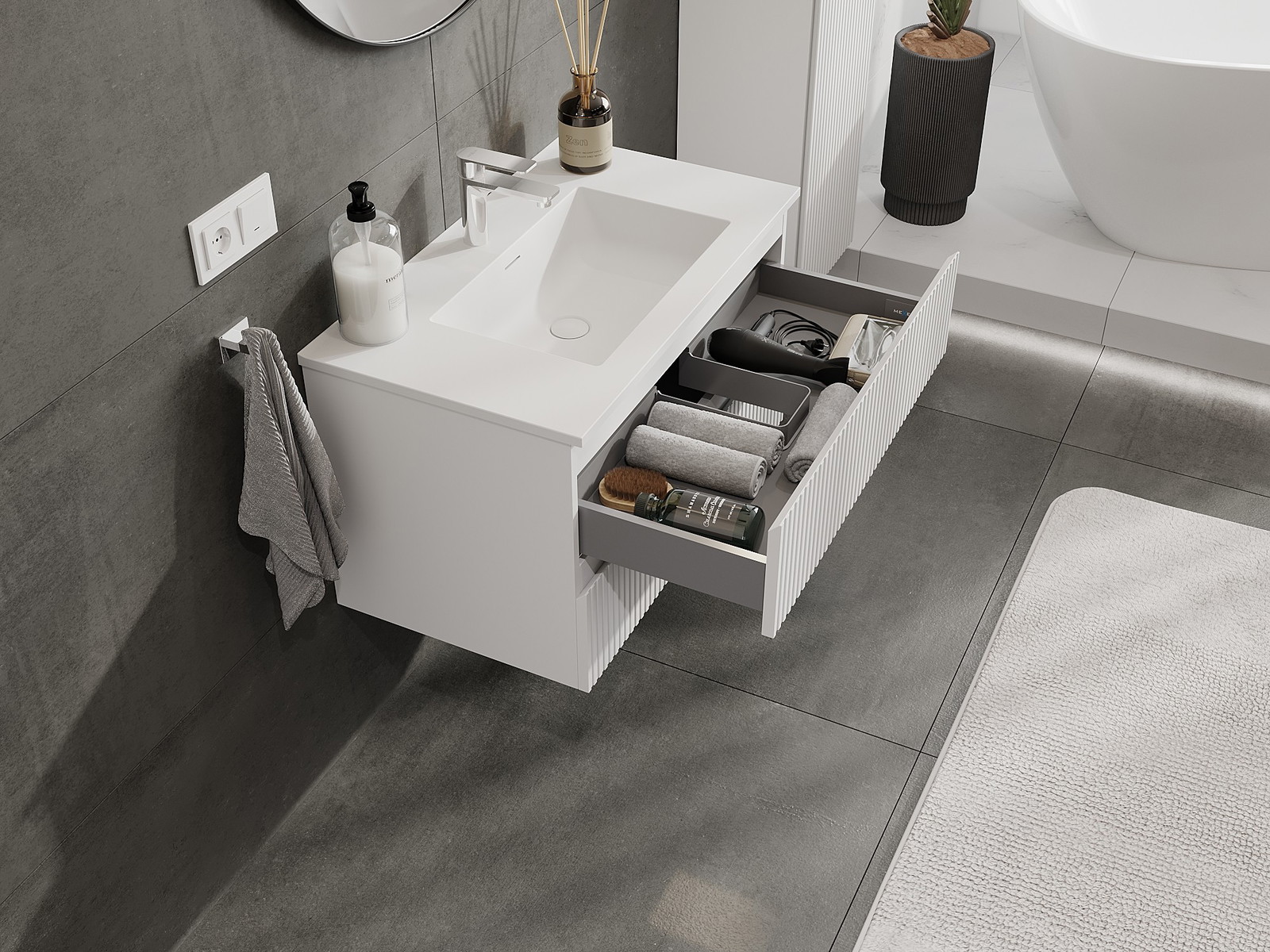 Изрезът в чекмеджето е проектиран по такъв начин, че да побере сифона, който е необходим в мивковите инсталации. Благодарение на това мебелът може да бъде монтиран напълно функционално, без да се налага отказване от пространството в чекмеджето заради инсталацията.
