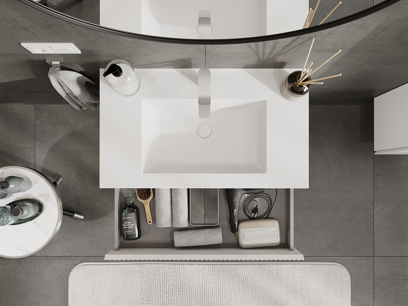 Корпусът на шкафа се доставя напълно сглобен, което означава максимално удобство и спестяване на време. Не е нужно да губите часове за сглобяване на мебела – просто го монтирайте на избраното място в банята. Това е идеалното решение за хора, които ценят бързия монтаж и незабавния ефект.