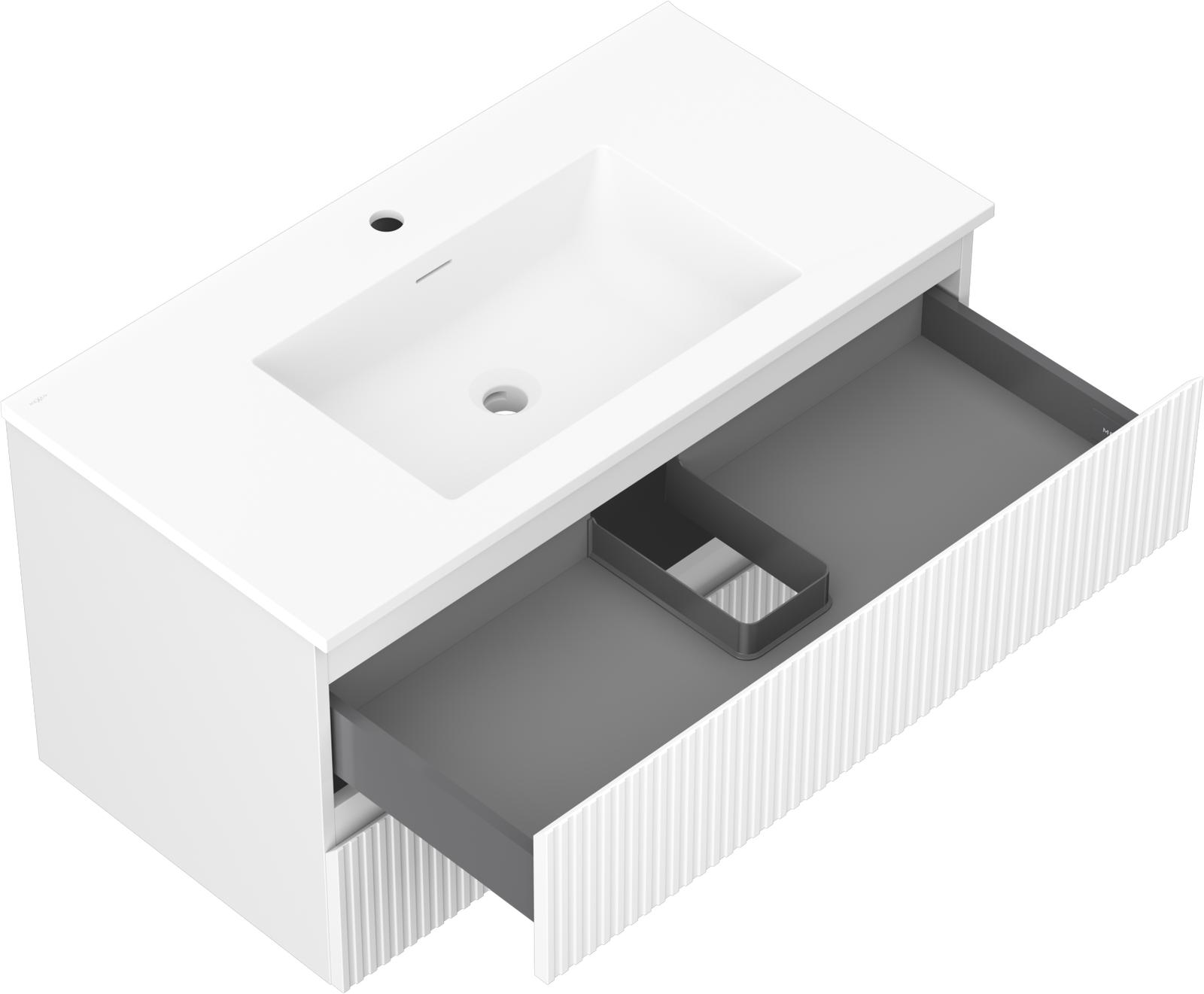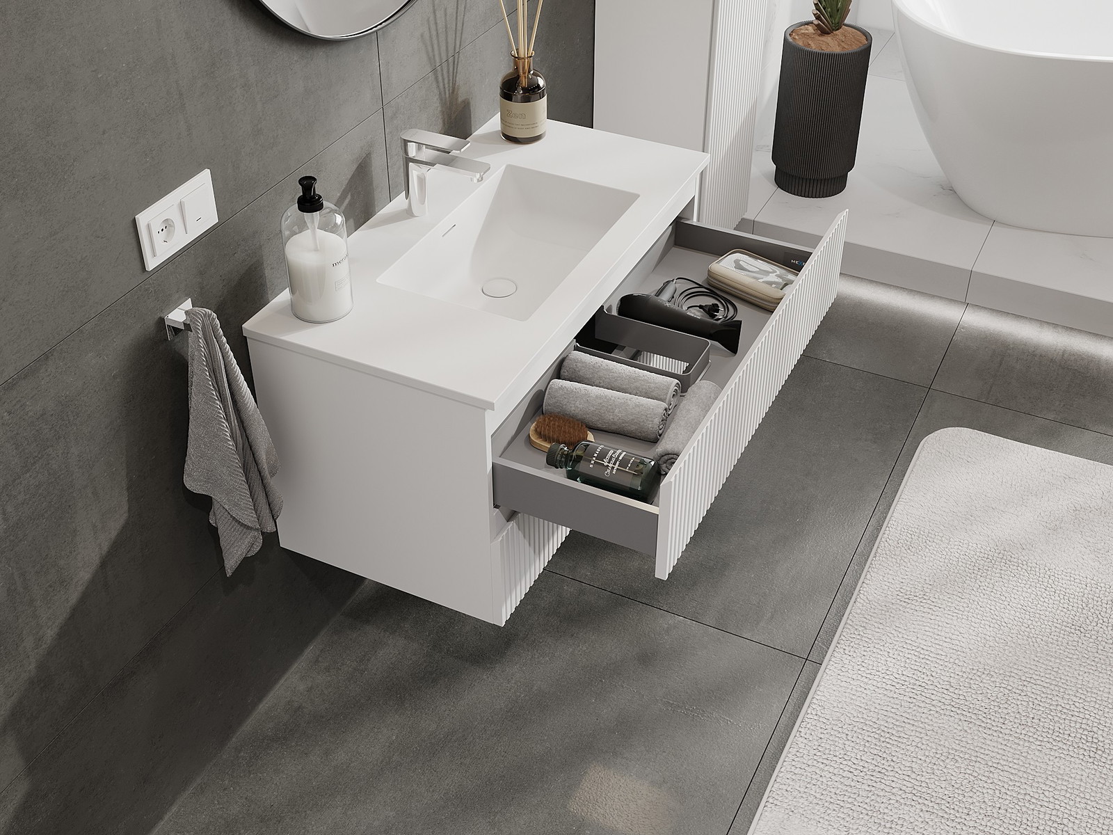 Изрезът в чекмеджето е проектиран по такъв начин, че да побере сифона, който е необходим в мивковите инсталации. Благодарение на това мебелът може да бъде монтиран напълно функционално, без да се налага отказване от пространството в чекмеджето заради инсталацията.