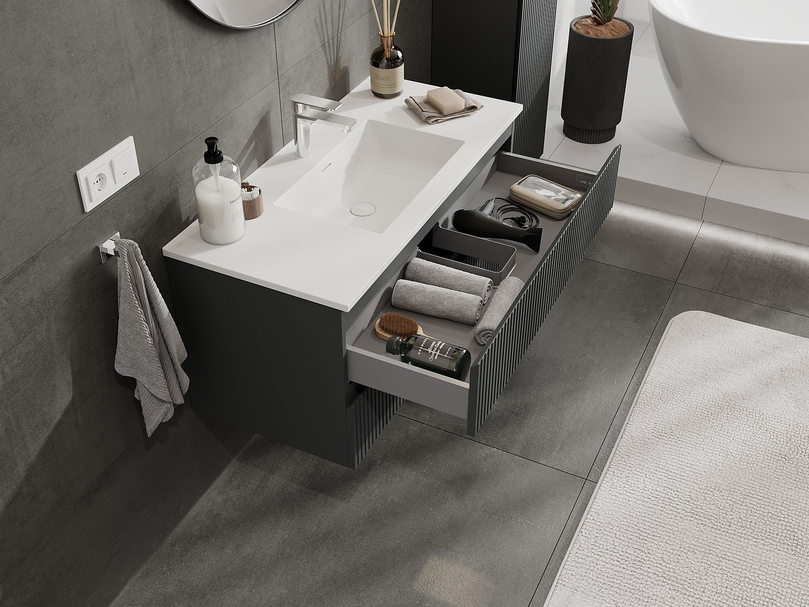 Изрезът в чекмеджето е проектиран по такъв начин, че да побере сифона, който е необходим в мивковите инсталации. Благодарение на това мебелът може да бъде монтиран напълно функционално, без да се налага отказване от пространството в чекмеджето заради инсталацията.