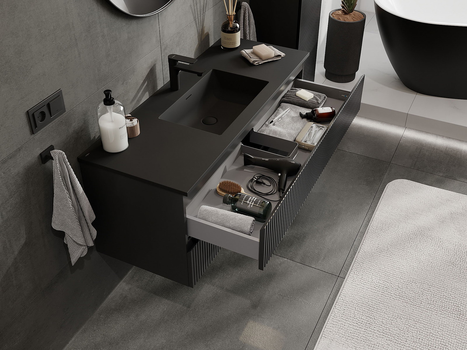 Изрезът в чекмеджето е проектиран по такъв начин, че да побере сифона, който е необходим в мивковите инсталации. Благодарение на това мебелът може да бъде монтиран напълно функционално, без да се налага отказване от пространството в чекмеджето заради инсталацията.