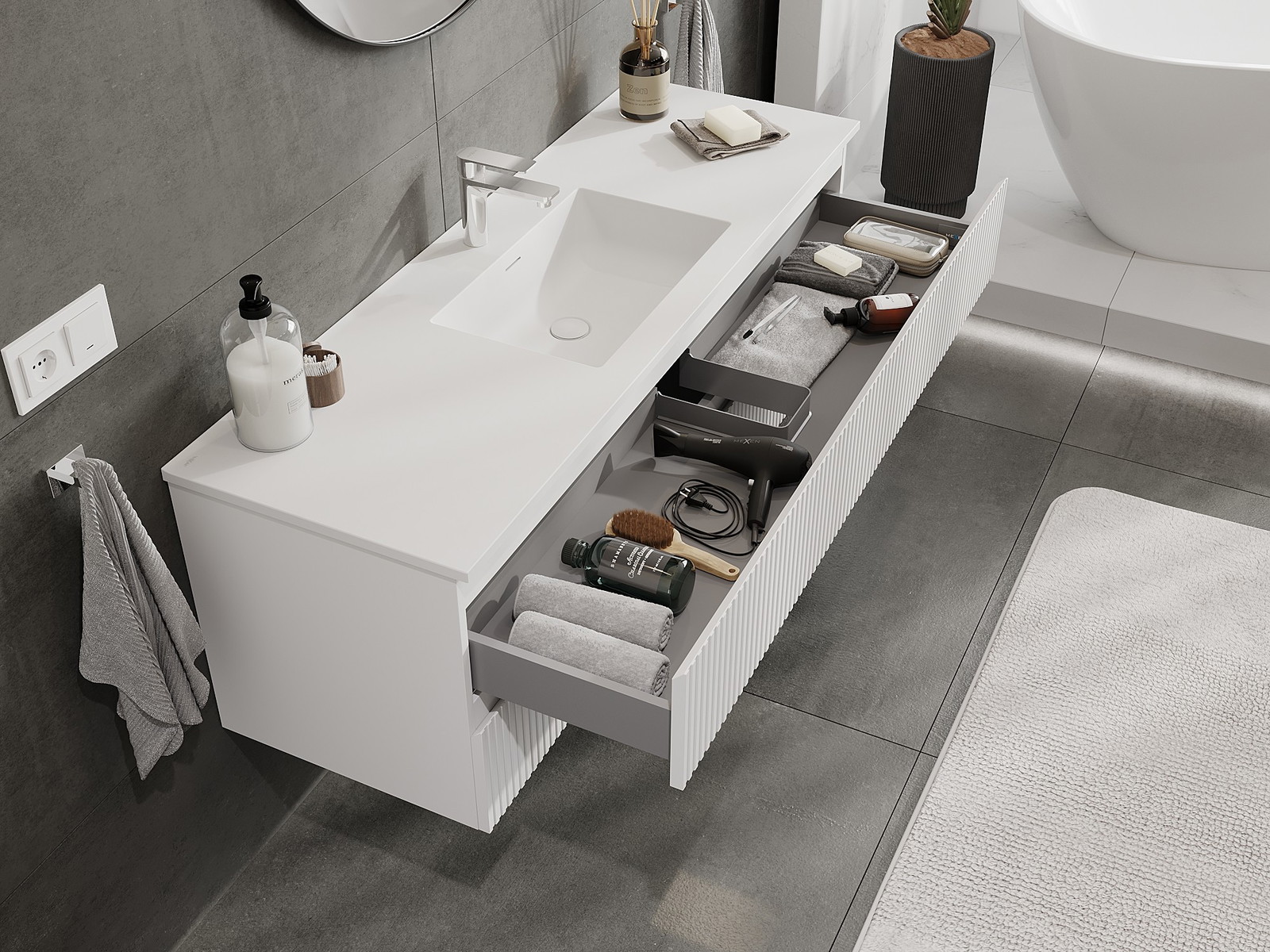 Нашите модулни мебели за баня могат да се комбинират в различни цветови конфигурации, което позволява пълна персонализация. Може да се избере както външният вид, така и функциите на отделните елементи, което позволява съчетаване на мебелите със собствените стилови и функционални предпочитания.