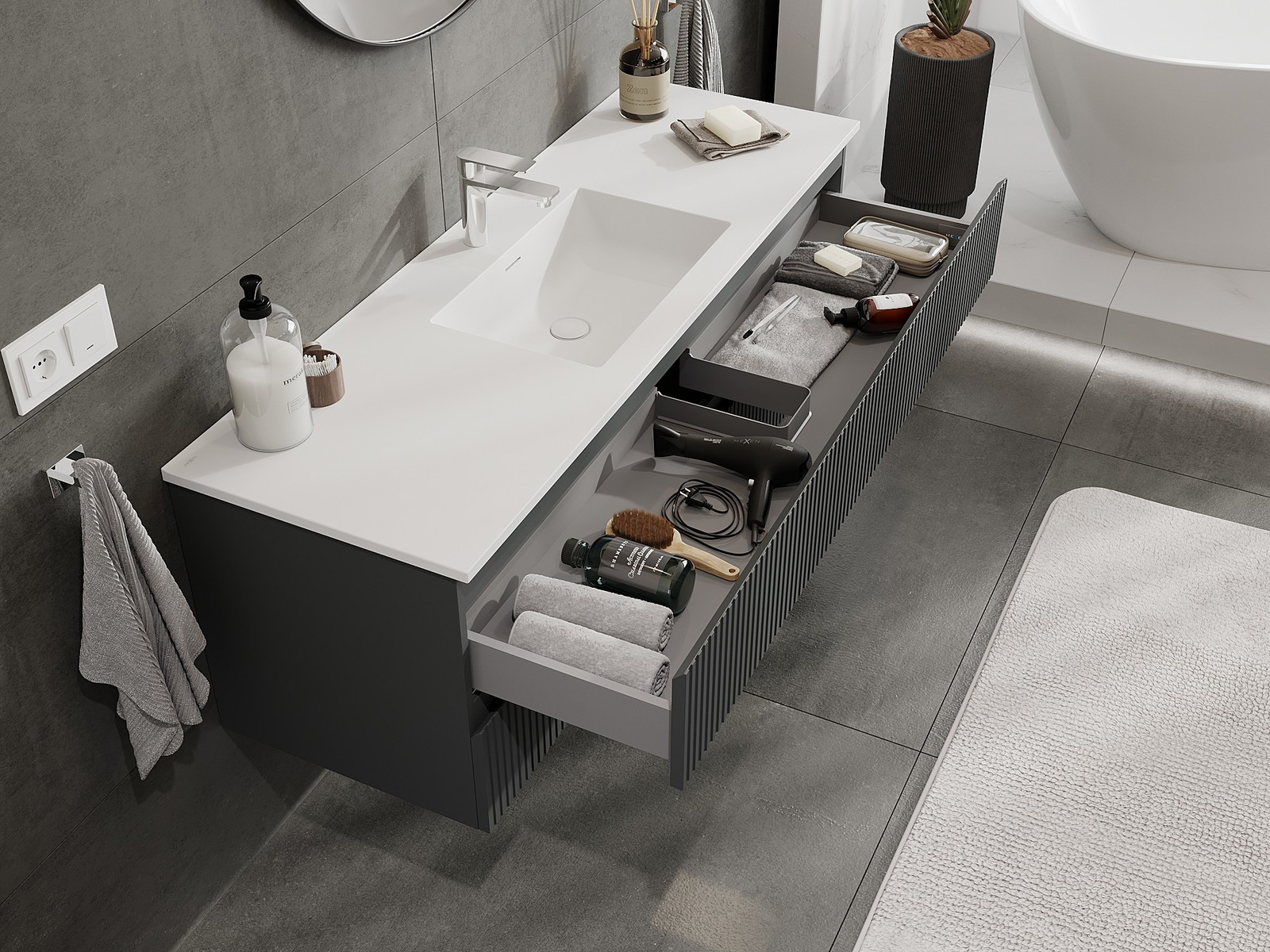 Нашите модулни мебели за баня могат да се комбинират в различни цветови конфигурации, което позволява пълна персонализация. Може да се избере както външният вид, така и функциите на отделните елементи, което позволява съчетаване на мебелите със собствените стилови и функционални предпочитания.