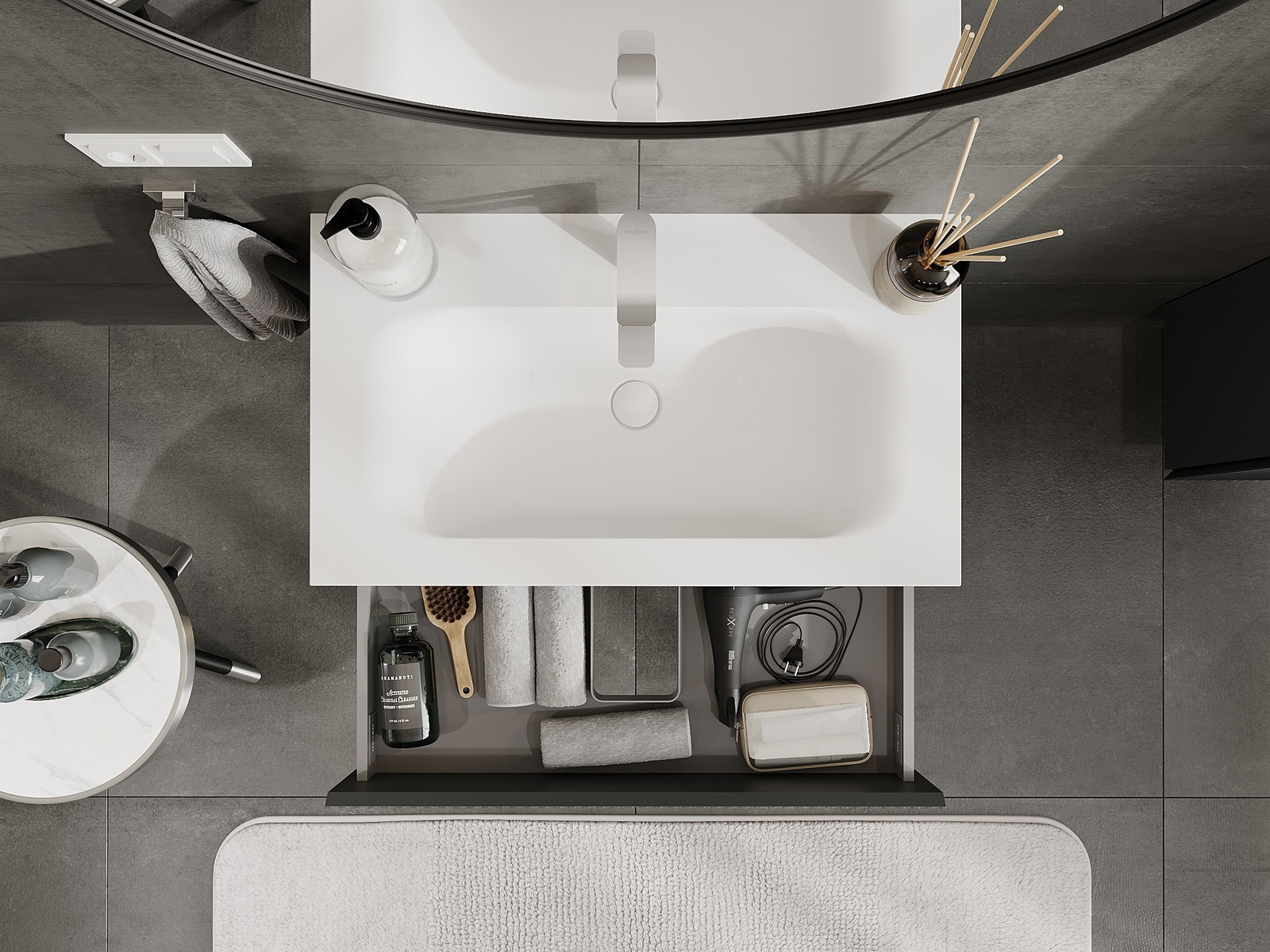 Изрезът в чекмеджето е проектиран по такъв начин, че да побере сифона, който е необходим в мивковите инсталации. Благодарение на това мебелът може да бъде монтиран напълно функционално, без да се налага отказване от пространството в чекмеджето заради инсталацията.