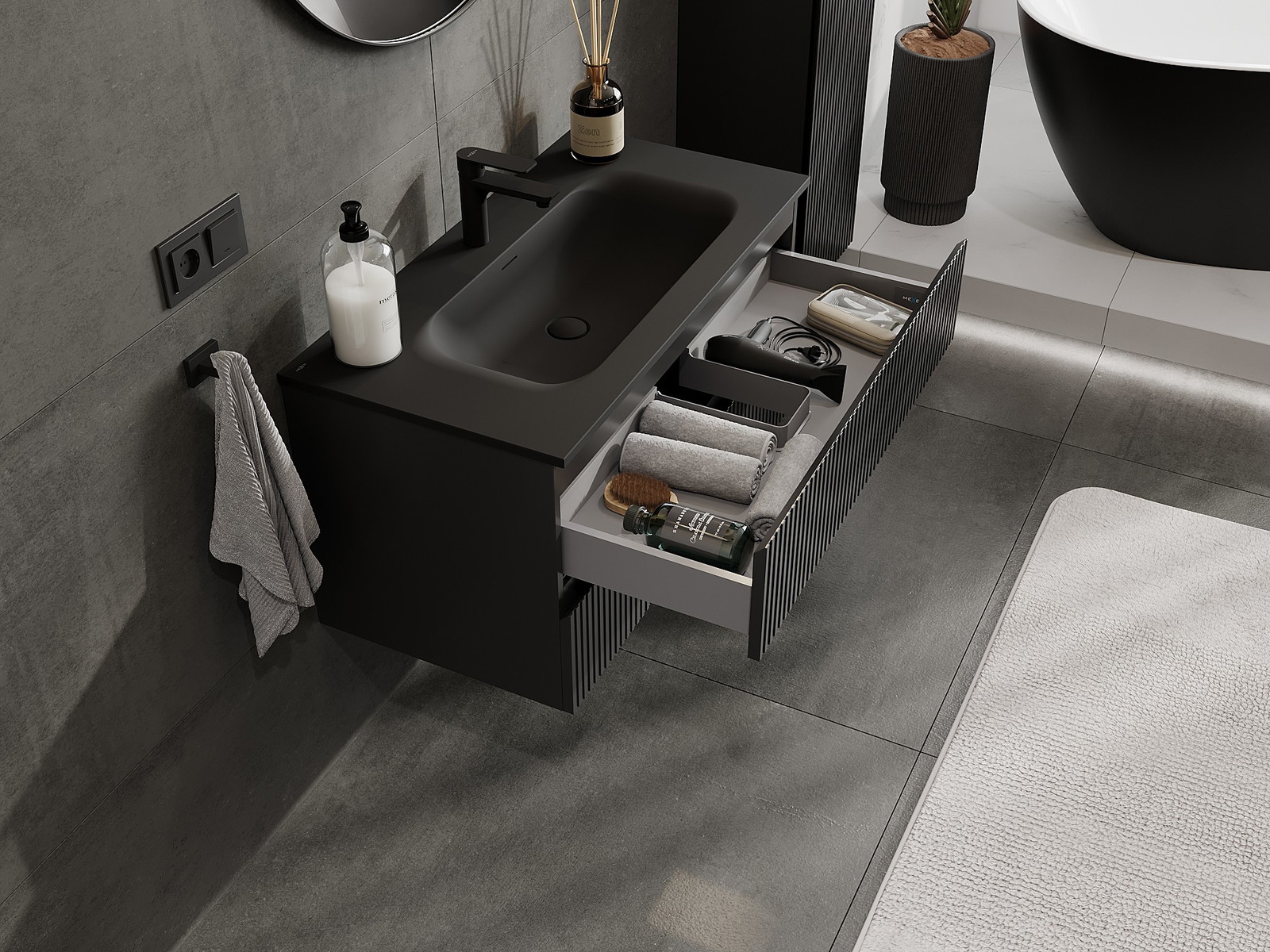 Изрезът в чекмеджето е проектиран по такъв начин, че да побере сифона, който е необходим в мивковите инсталации. Благодарение на това мебелът може да бъде монтиран напълно функционално, без да се налага отказване от пространството в чекмеджето заради инсталацията.