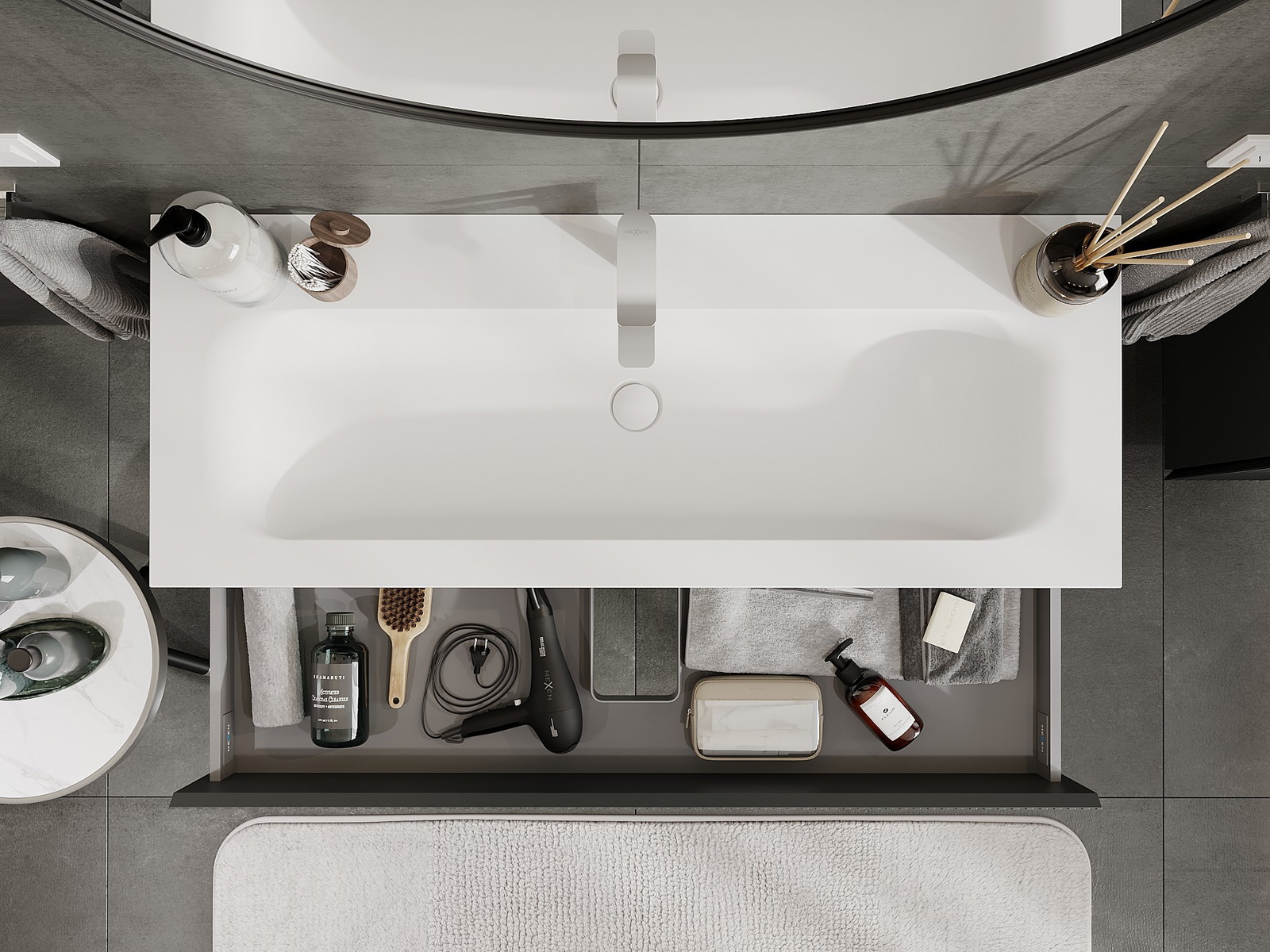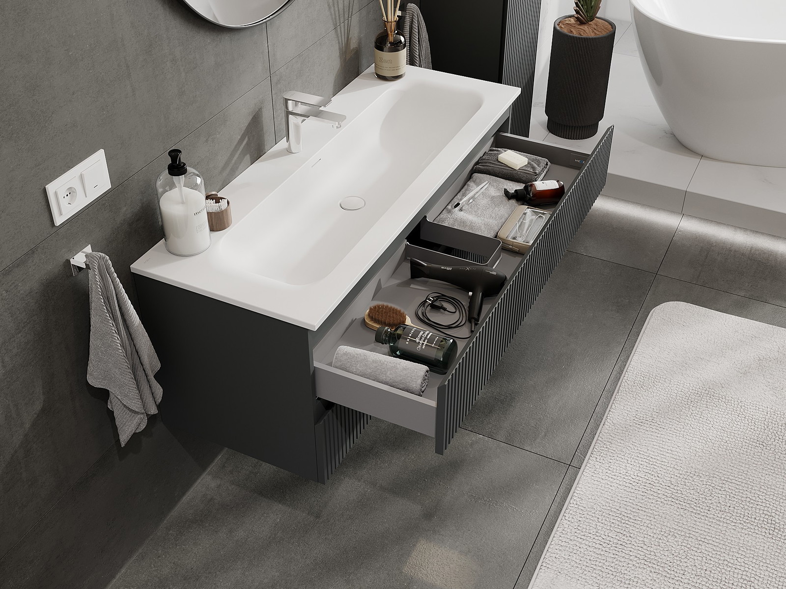 Изрезът в чекмеджето е проектиран по такъв начин, че да побере сифона, който е необходим в мивковите инсталации. Благодарение на това мебелът може да бъде монтиран напълно функционално, без да се налага отказване от пространството в чекмеджето заради инсталацията.