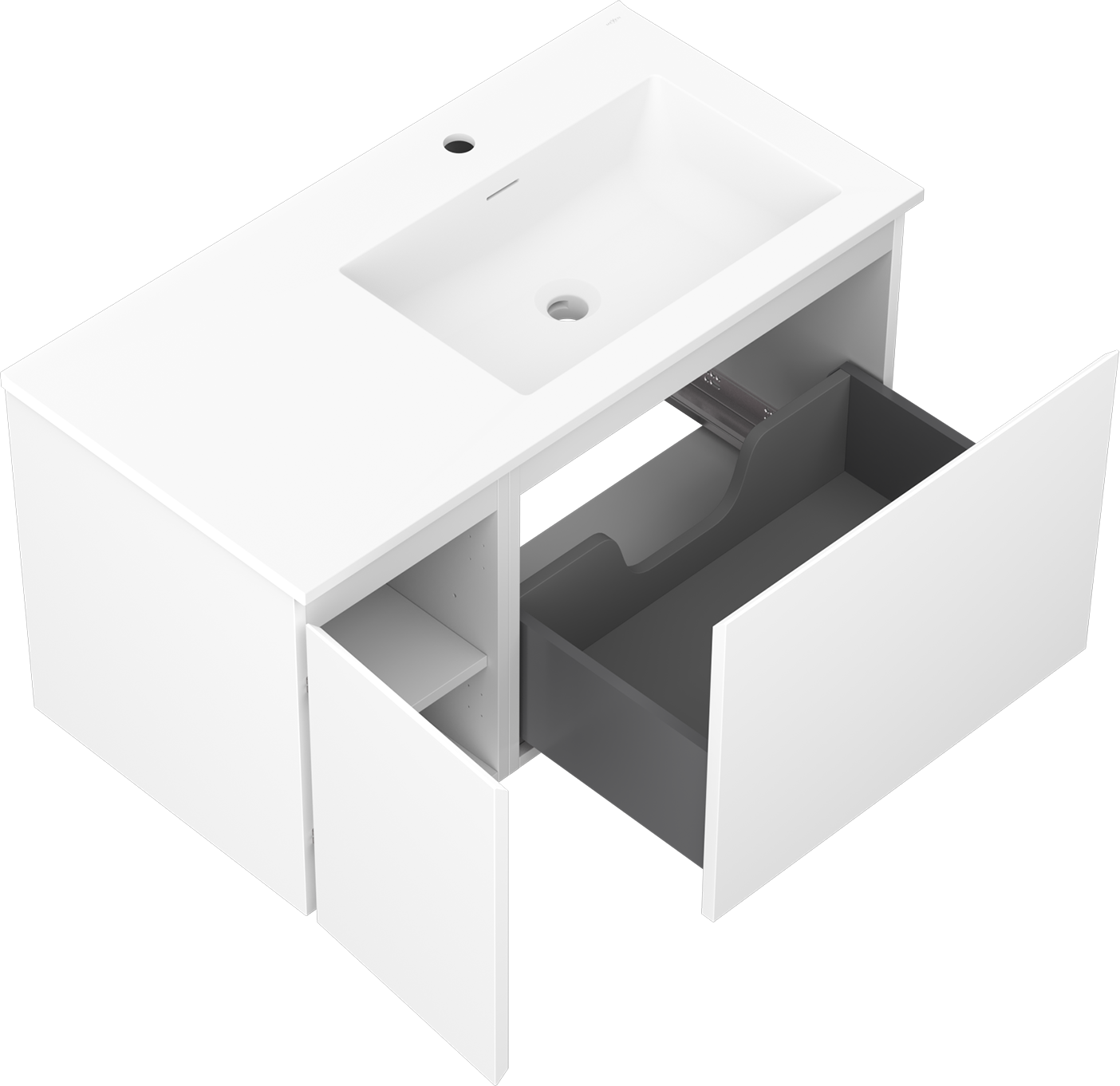 Изрезът в чекмеджето е проектиран по такъв начин, че да побере сифона, който е необходим в мивковите инсталации. Благодарение на това мебелът може да бъде монтиран напълно функционално, без да се налага отказване от пространството в чекмеджето заради инсталацията.