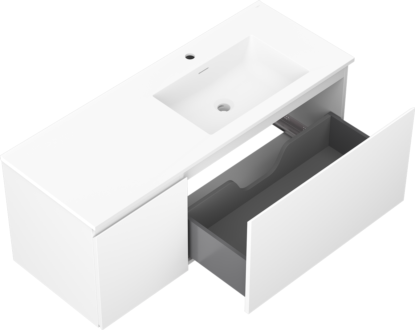 Изрезът в чекмеджето е проектиран по такъв начин, че да побере сифона, който е необходим в мивковите инсталации. Благодарение на това мебелът може да бъде монтиран напълно функционално, без да се налага отказване от пространството в чекмеджето заради инсталацията.