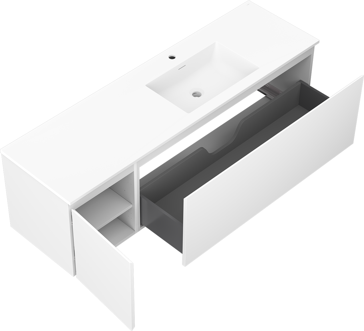 Изрезът в чекмеджето е проектиран по такъв начин, че да побере сифона, който е необходим в мивковите инсталации. Благодарение на това мебелът може да бъде монтиран напълно функционално, без да се налага отказване от пространството в чекмеджето заради инсталацията.