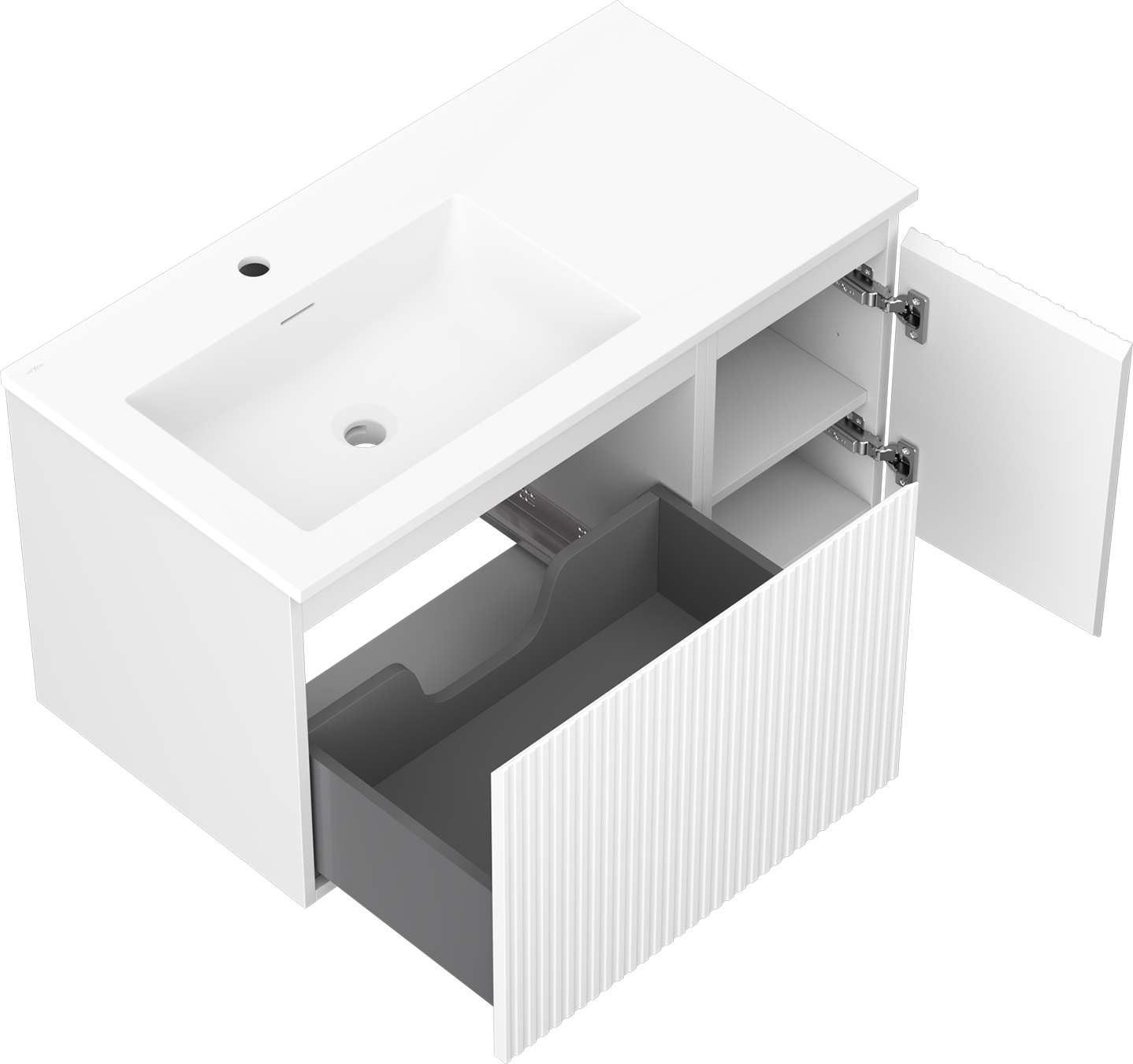 Изрезът в чекмеджето е проектиран по такъв начин, че да побере сифона, който е необходим в мивковите инсталации. Благодарение на това мебелът може да бъде монтиран напълно функционално, без да се налага отказване от пространството в чекмеджето заради инсталацията.