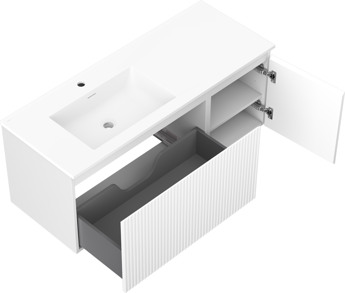 Изрезът в чекмеджето е проектиран по такъв начин, че да побере сифона, който е необходим в мивковите инсталации. Благодарение на това мебелът може да бъде монтиран напълно функционално, без да се налага отказване от пространството в чекмеджето заради инсталацията.