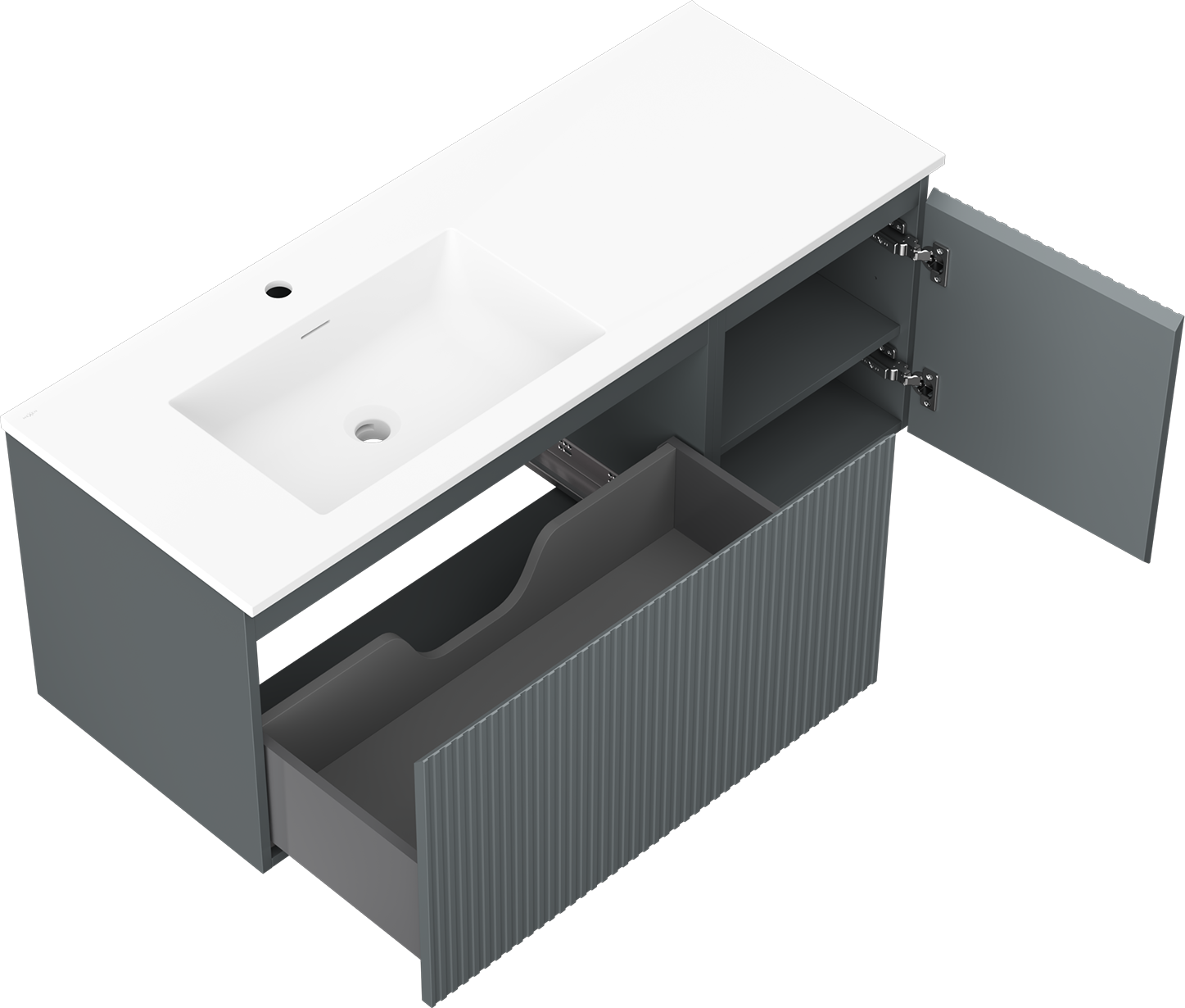 Изрезът в чекмеджето е проектиран по такъв начин, че да побере сифона, който е необходим в мивковите инсталации. Благодарение на това мебелът може да бъде монтиран напълно функционално, без да се налага отказване от пространството в чекмеджето заради инсталацията.