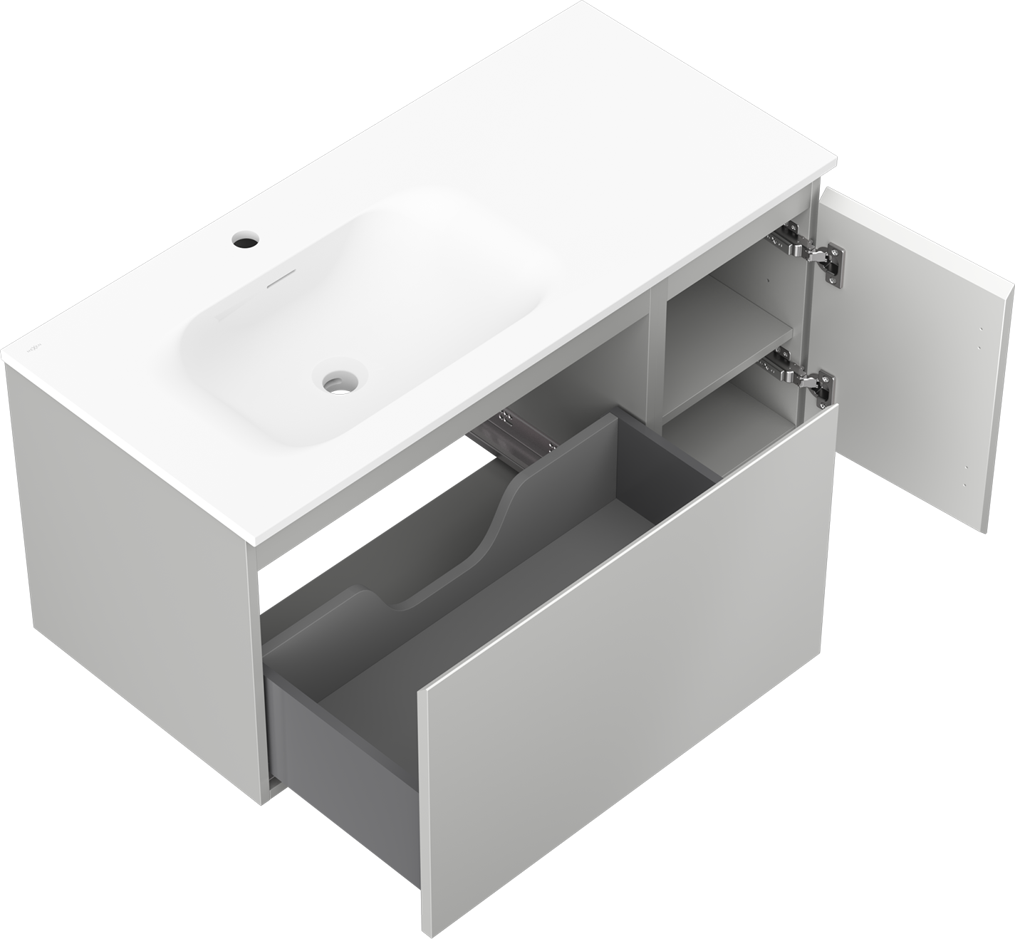 Изрезът в чекмеджето е проектиран по такъв начин, че да побере сифона, който е необходим в мивковите инсталации. Благодарение на това мебелът може да бъде монтиран напълно функционално, без да се налага отказване от пространството в чекмеджето заради инсталацията.