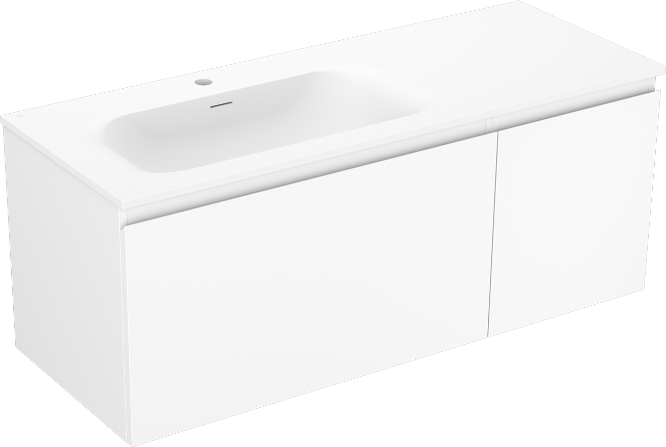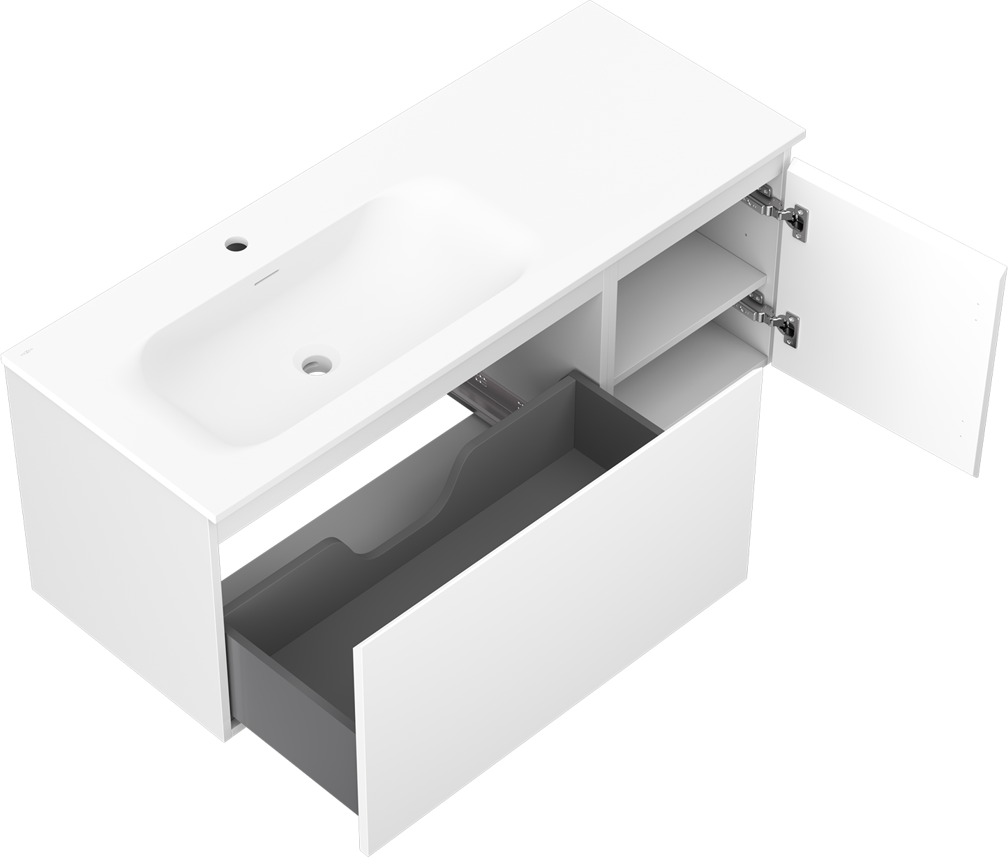 Изрезът в чекмеджето е проектиран по такъв начин, че да побере сифона, който е необходим в мивковите инсталации. Благодарение на това мебелът може да бъде монтиран напълно функционално, без да се налага отказване от пространството в чекмеджето заради инсталацията.
