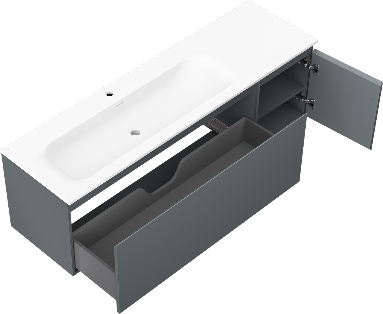 Изрезът в чекмеджето е проектиран по такъв начин, че да побере сифона, който е необходим в мивковите инсталации. Благодарение на това мебелът може да бъде монтиран напълно функционално, без да се налага отказване от пространството в чекмеджето заради инсталацията.