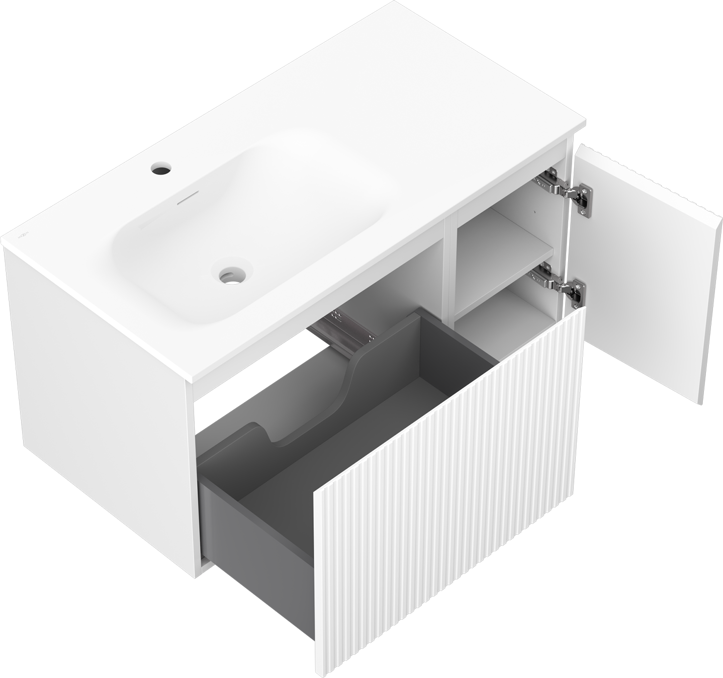 Mexen Rivel шкаф за баня 90 см с мивка Vela лява, 1S, 1D, релефна, бяла мат - 91A23-09047-3-BBFF01-W23L01
