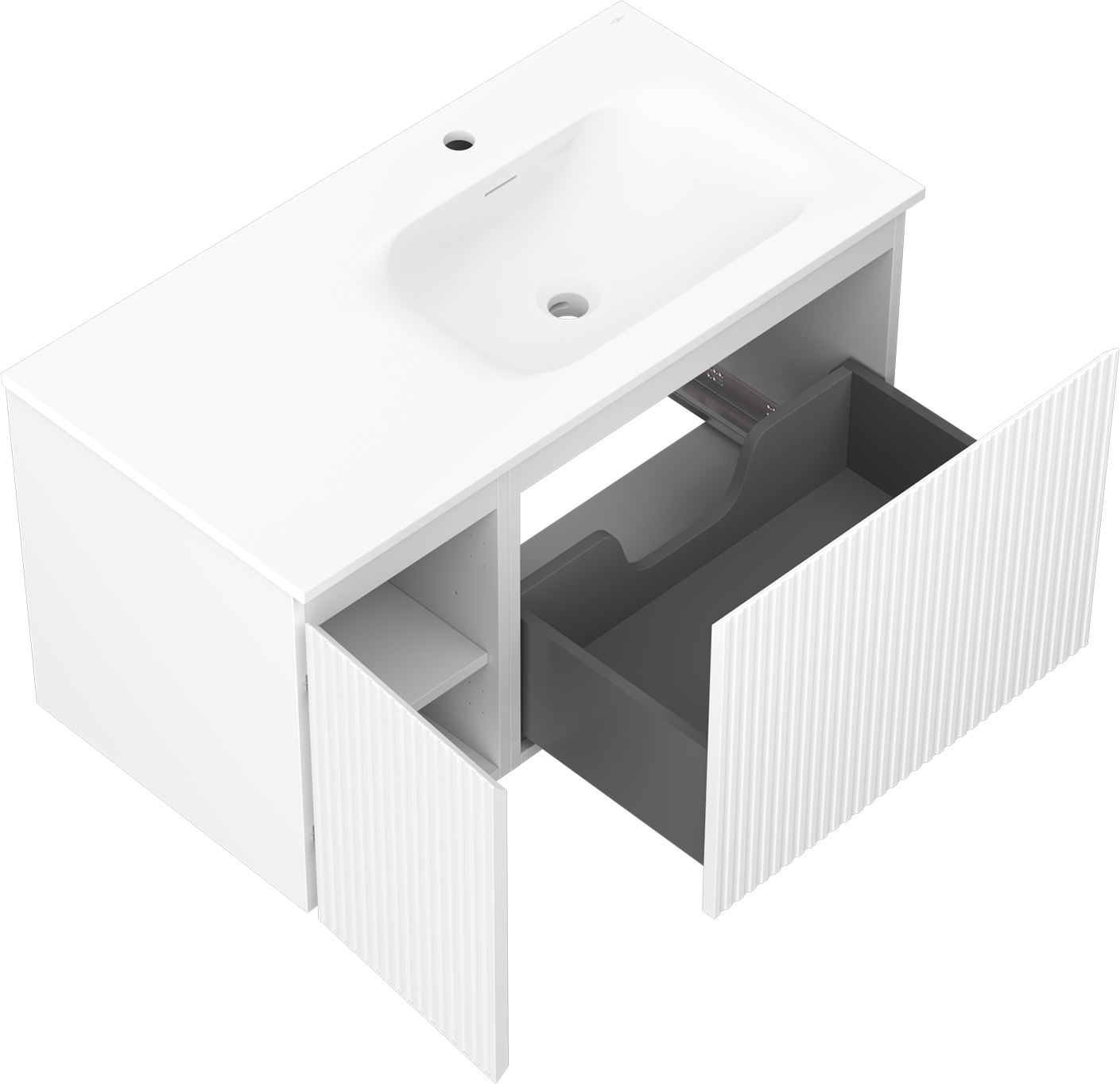 Изрезът в чекмеджето е проектиран по такъв начин, че да побере сифона, който е необходим в мивковите инсталации. Благодарение на това мебелът може да бъде монтиран напълно функционално, без да се налага отказване от пространството в чекмеджето заради инсталацията.