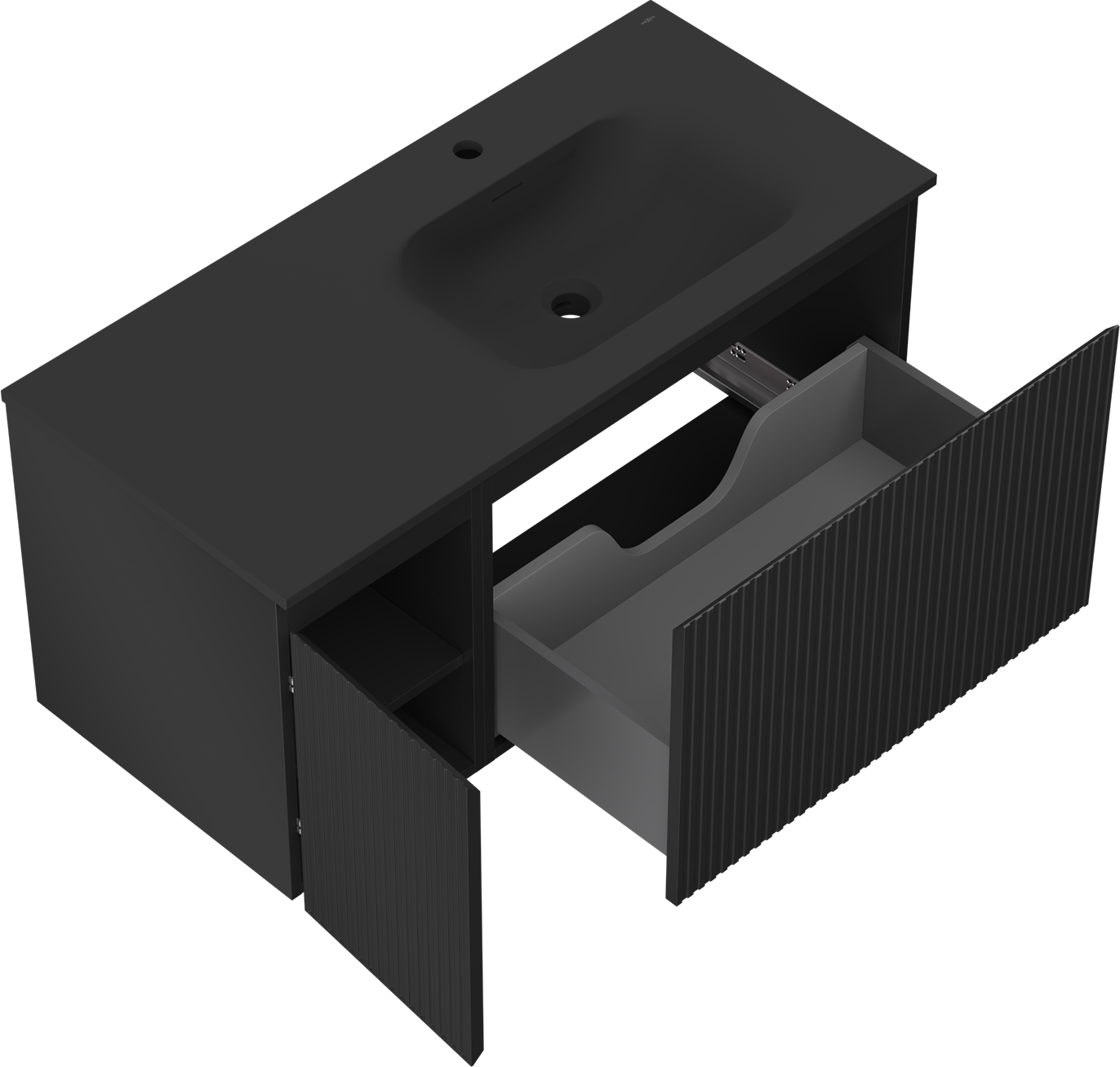 Изрезът в чекмеджето е проектиран по такъв начин, че да побере сифона, който е необходим в мивковите инсталации. Благодарение на това мебелът може да бъде монтиран напълно функционално, без да се налага отказване от пространството в чекмеджето заради инсталацията.